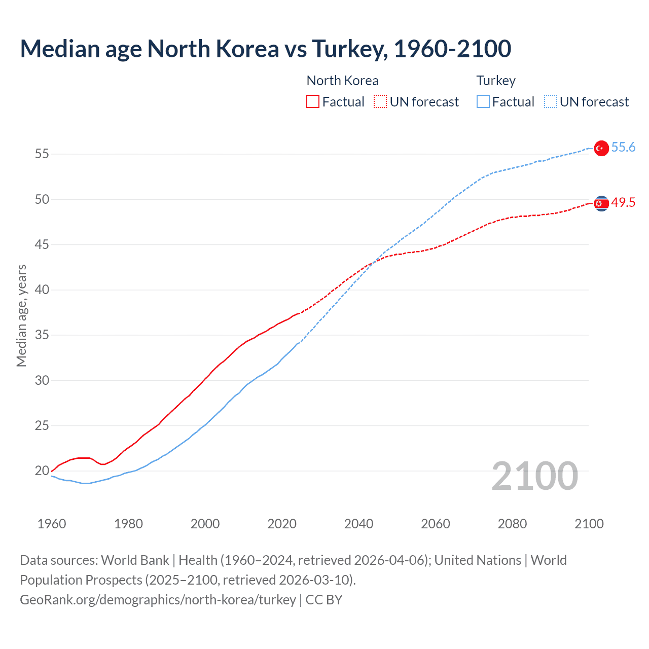 Median age North Korea vs Turkey, 1960-2100