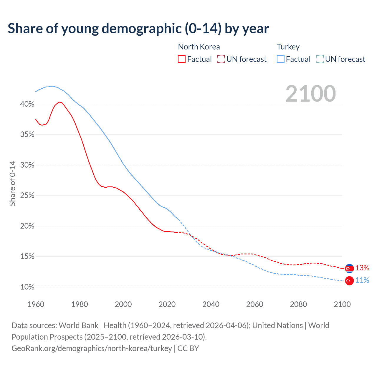 - The share of young demographic (0-15 years old) in North Korea is 18.9% vs 21.4% in Turkey.