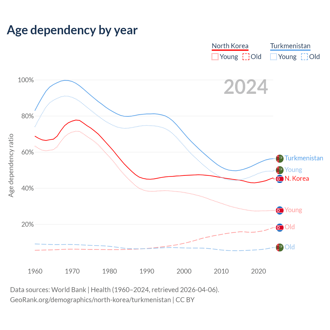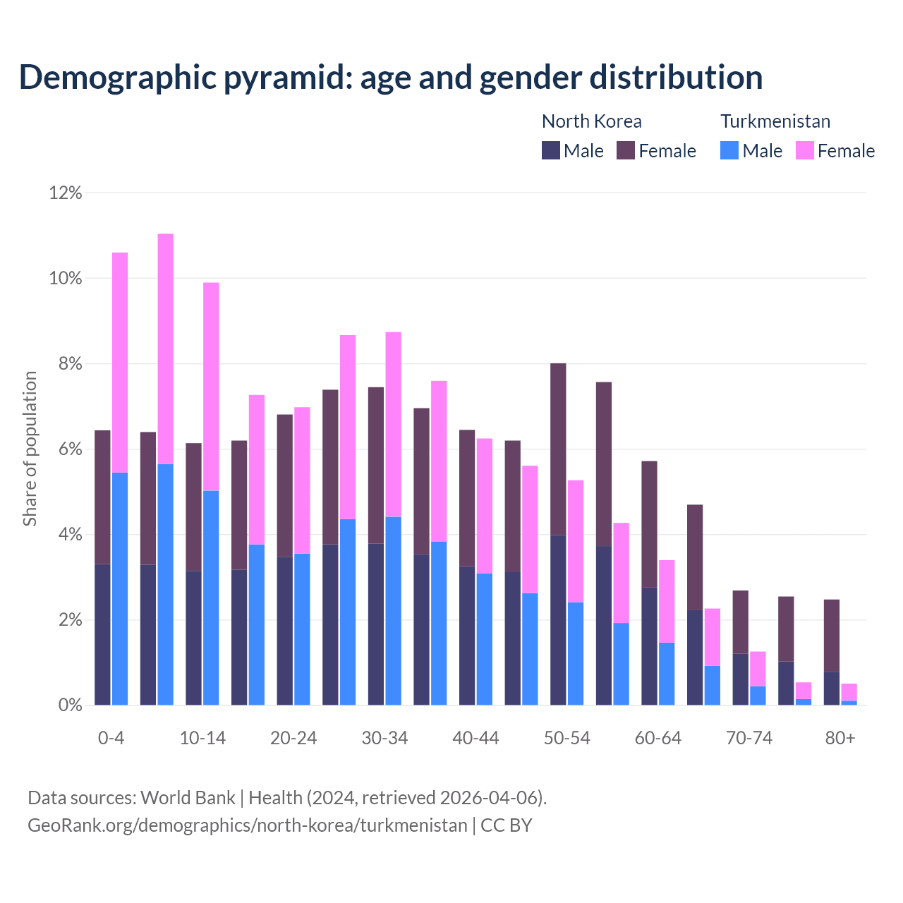 - North Korea is ranked 62/196 by median age (oldest to youngest) vs 119/196 for Turkmenistan.