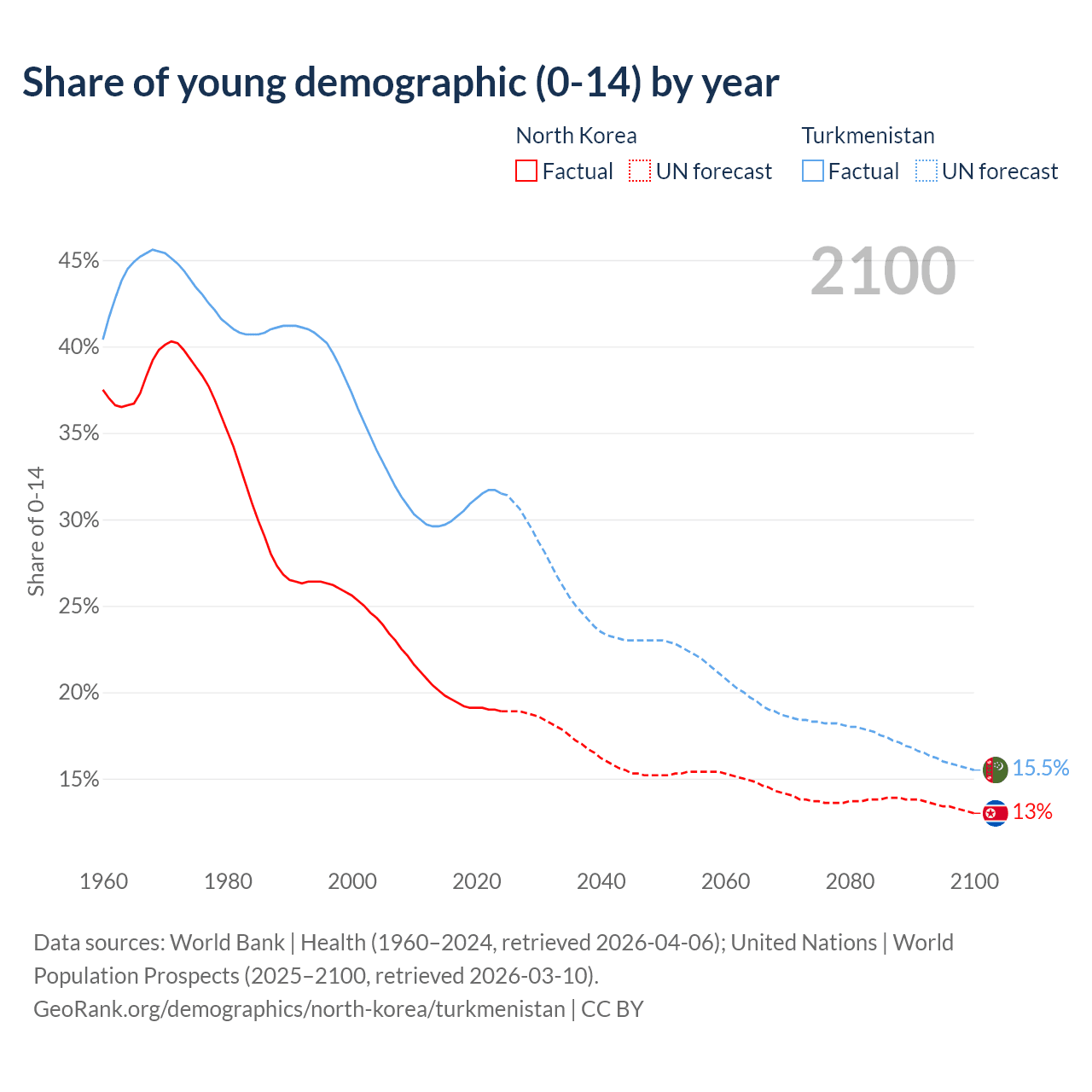 - The share of young demographic (0-15 years old) in North Korea is 18.9% vs 31.5% in Turkmenistan.