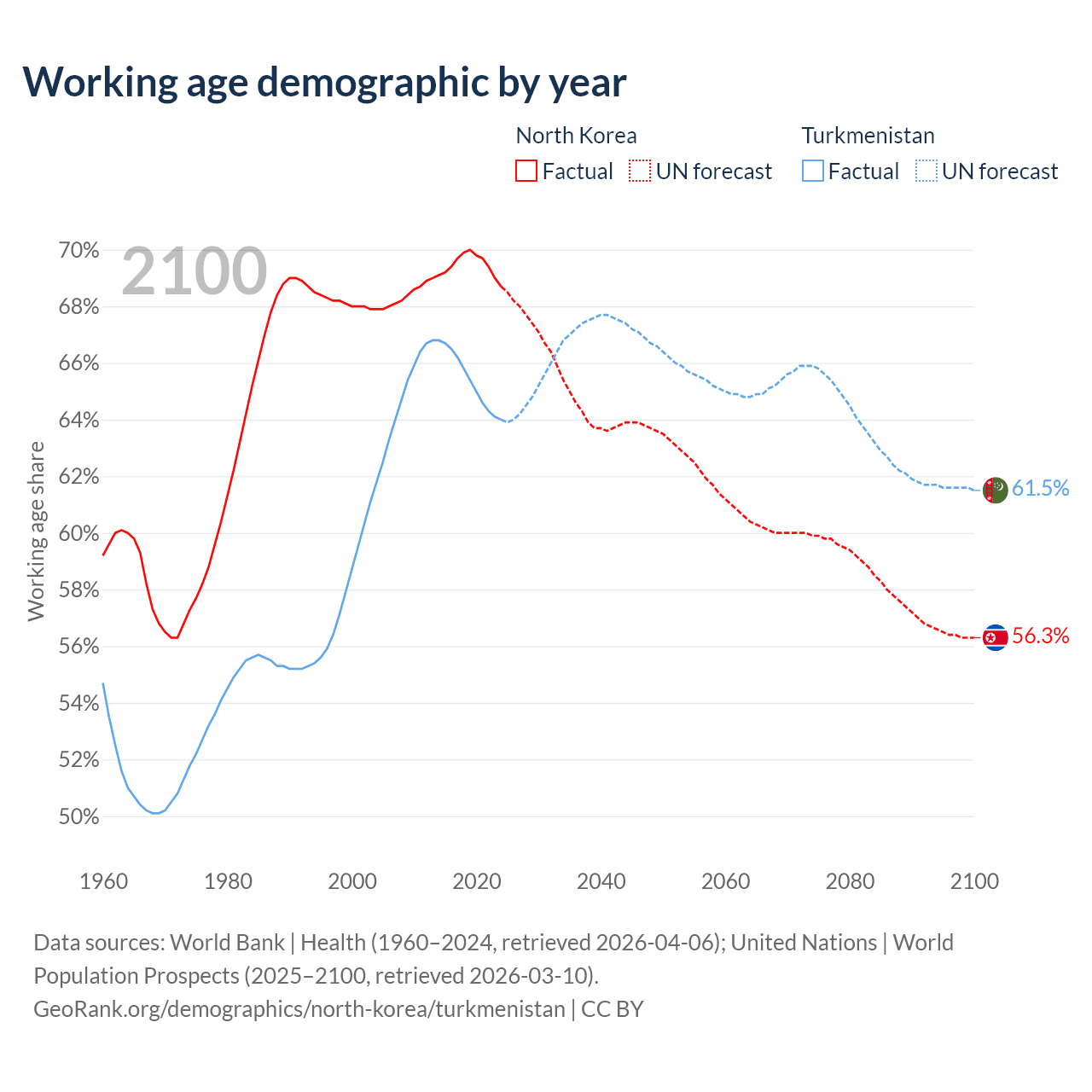 - North Korea has 18.3M working age adults (aged 15-64) vs 4.97M in Turkmenistan.