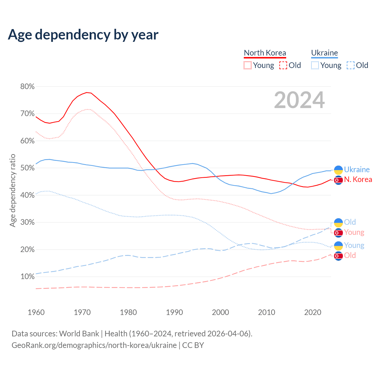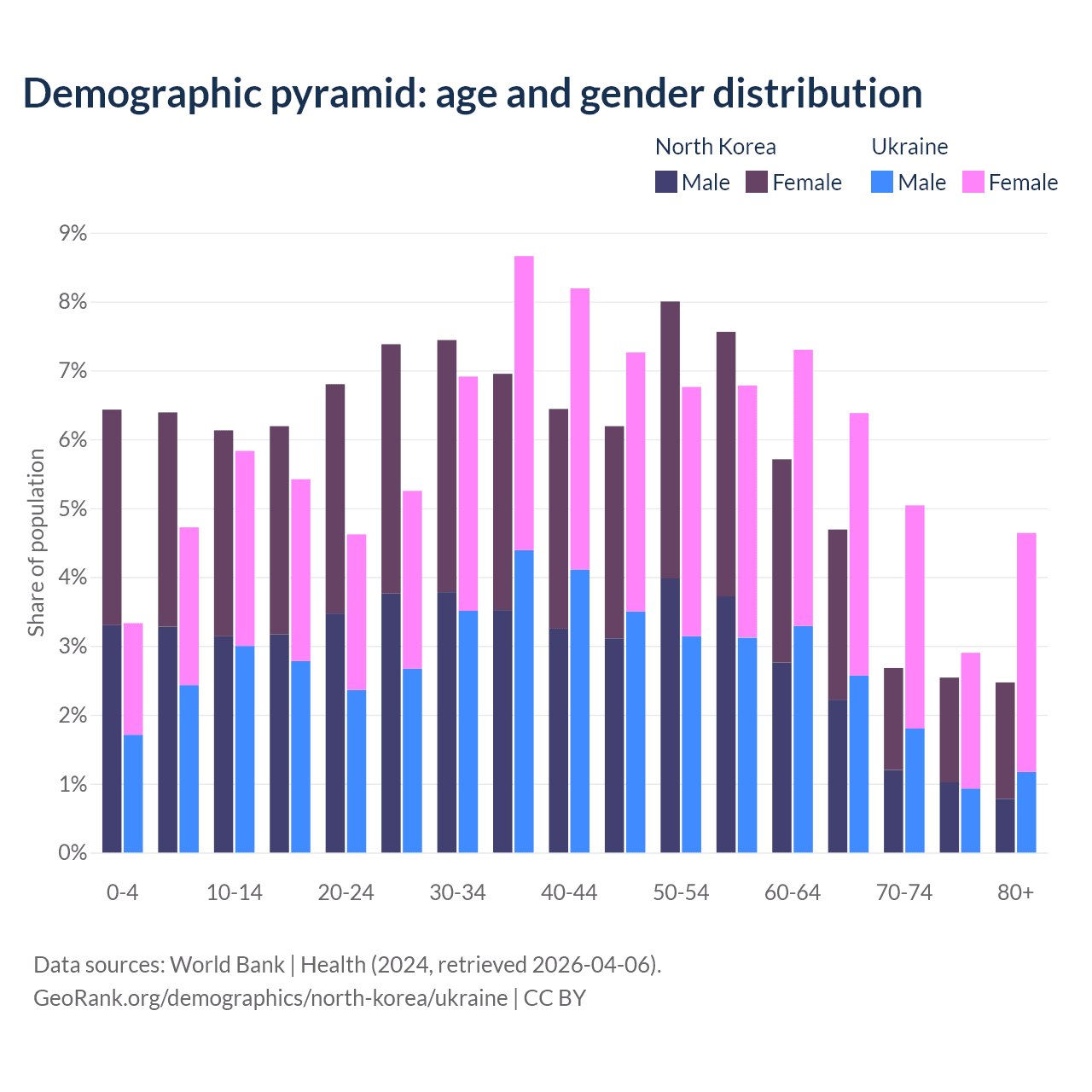 - North Korea is ranked 62/196 by median age (oldest to youngest) vs 26/196 for Ukraine.