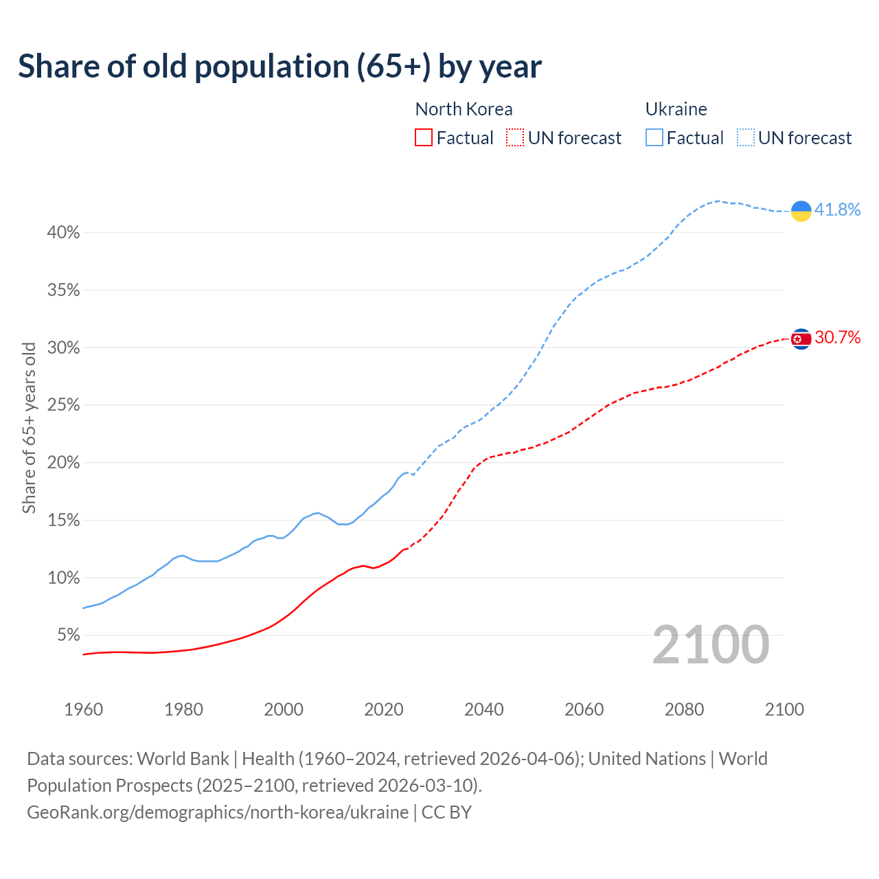 The share of older people aged 65 and over is 12.4% in North Korea and 19% in Ukraine. Life expectancy in North Korea compared to Ukraine .