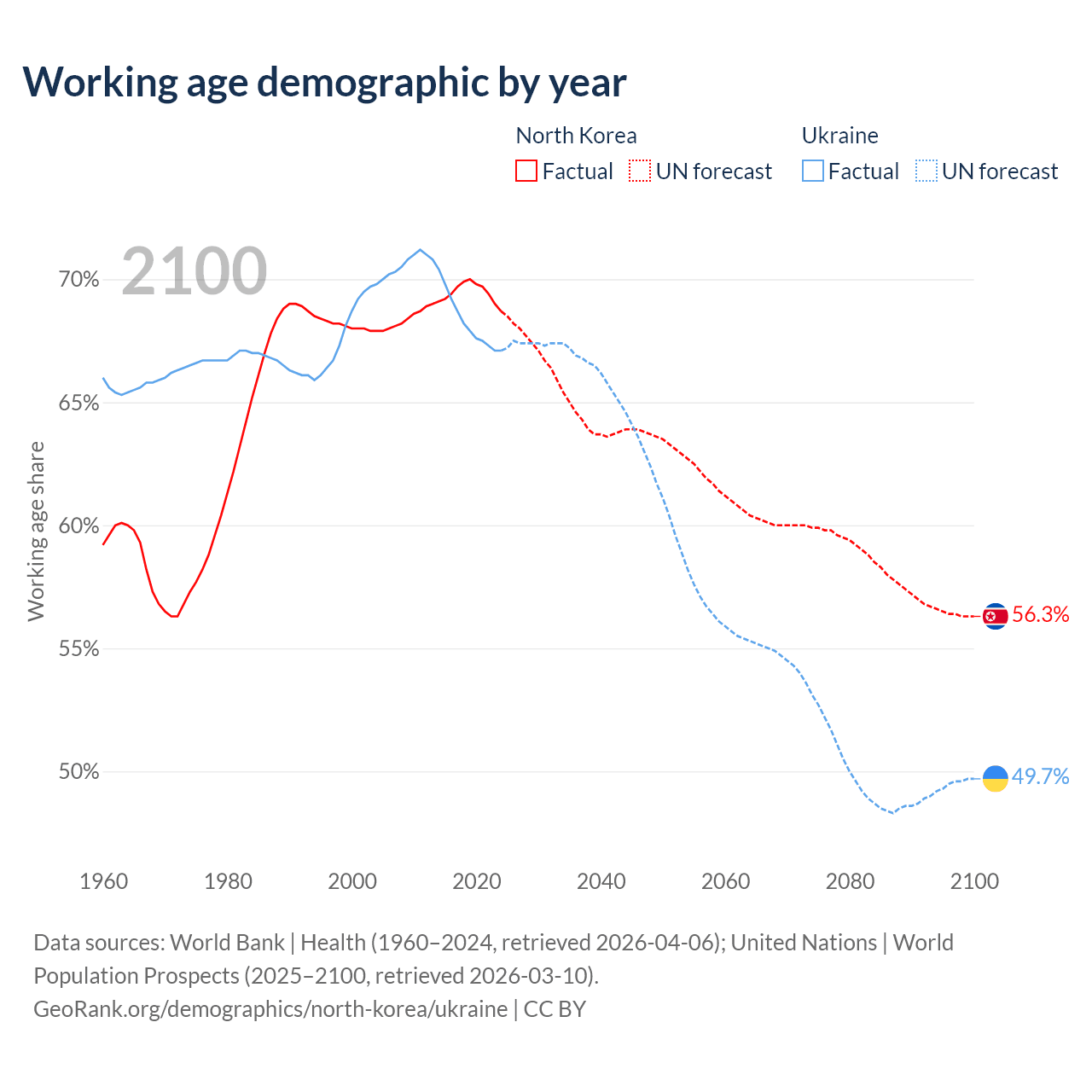 - North Korea has 18.3M working age adults (aged 15-64) vs 26.9M in Ukraine.