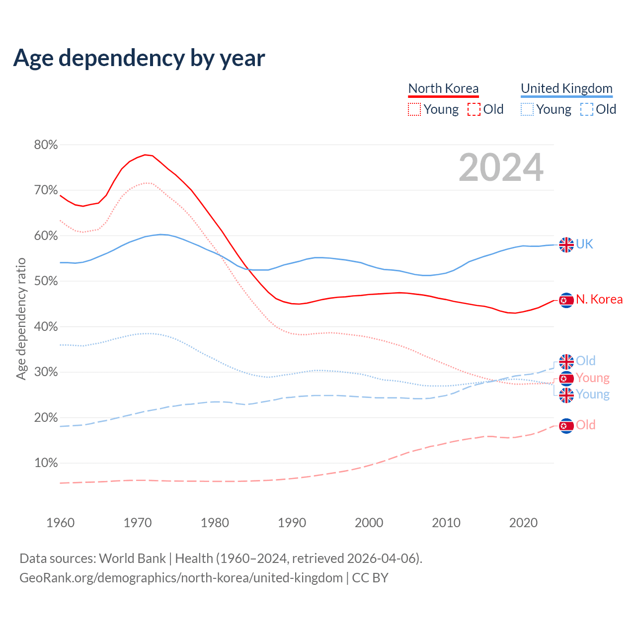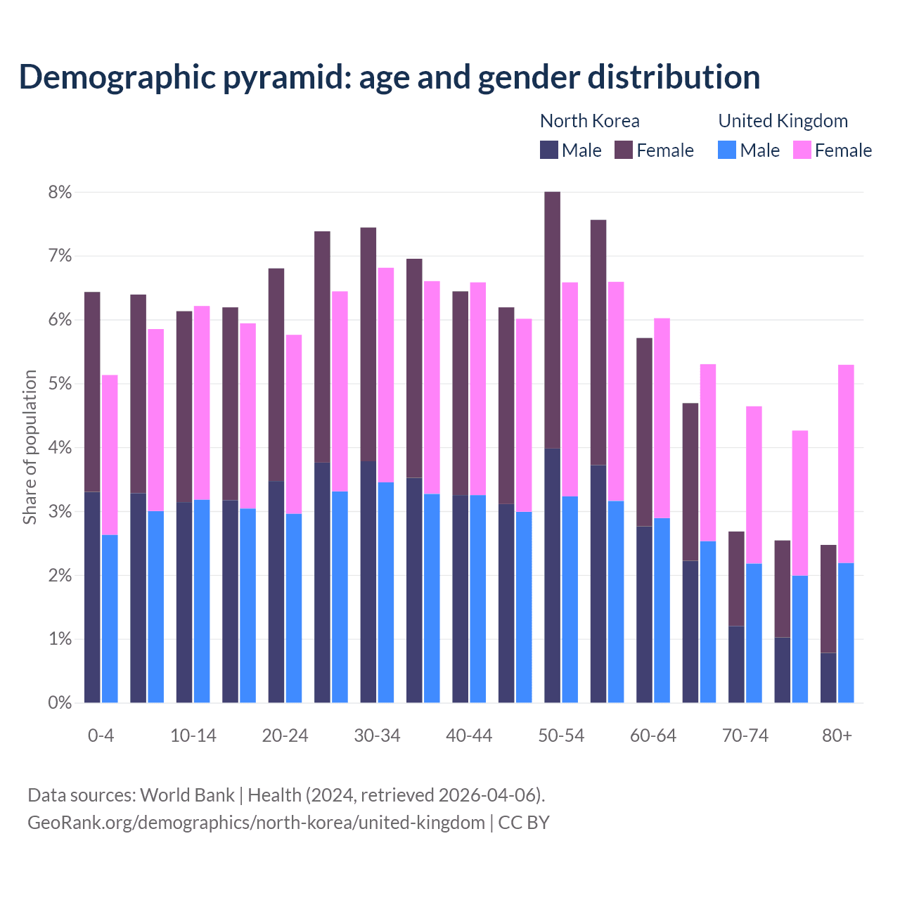 - North Korea is ranked 62/196 by median age (oldest to youngest) vs 41/196 for the United Kingdom.