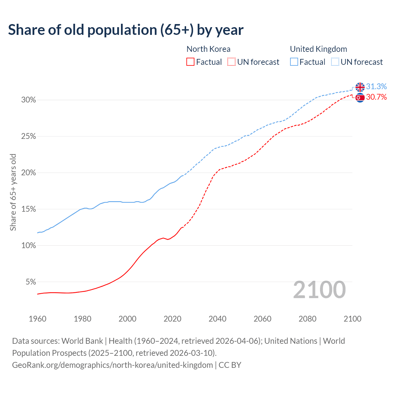- The share of old-age demographic (65+) in North Korea is 12.4% vs 19.5% in the United Kingdom.