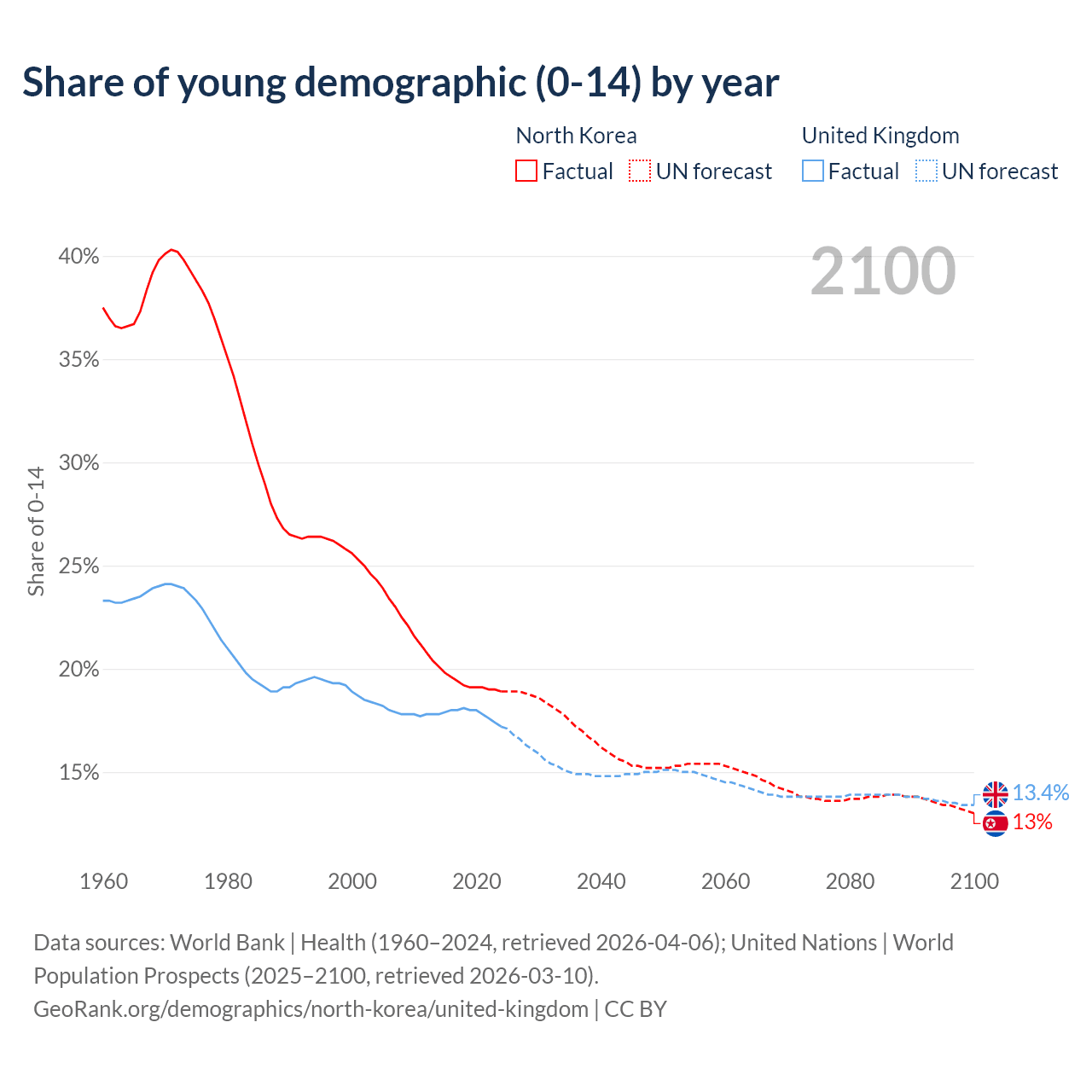 - The share of young demographic (0-15 years old) in North Korea is 18.9% vs 17.2% in the United Kingdom.