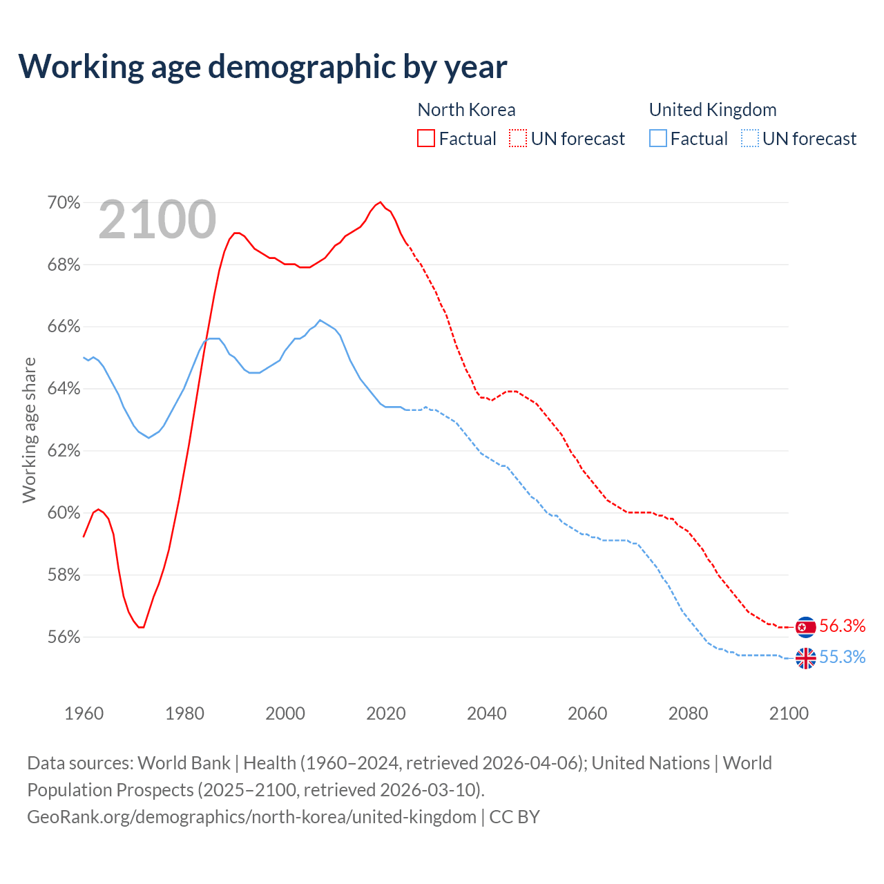 - North Korea has 18.3M working age adults (aged 15-64) vs 44.4M in the United Kingdom.