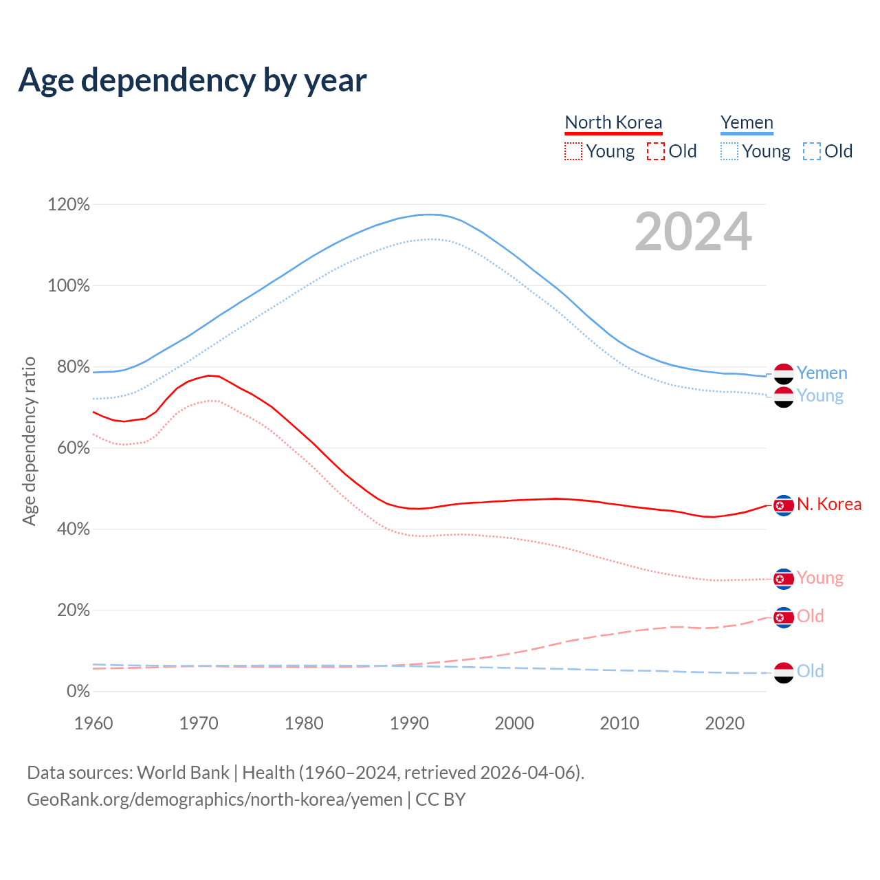 - North Korea is ranked 62/196 by median age (oldest to youngest) vs 174/196 for Yemen.