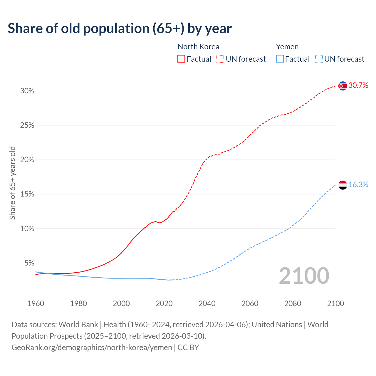 - The share of old-age demographic (65+) in North Korea is 12.4% vs 2.52% in Yemen.