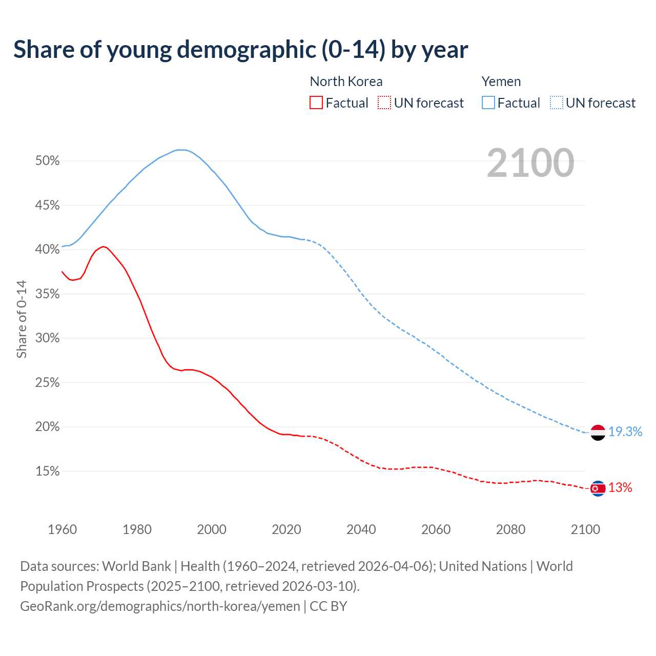 - The share of young demographic (0-15 years old) in North Korea is 18.9% vs 41.1% in Yemen.