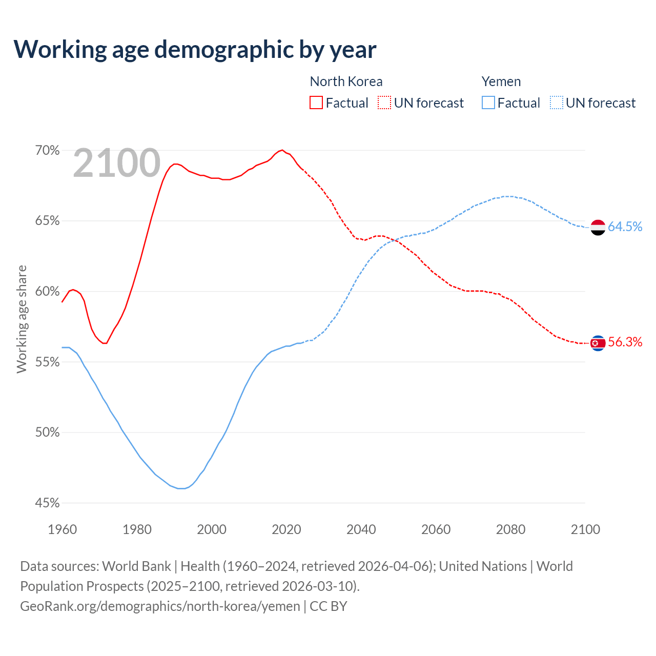 - North Korea has 18.3M working age adults (aged 15-64) vs 24.4M in Yemen.