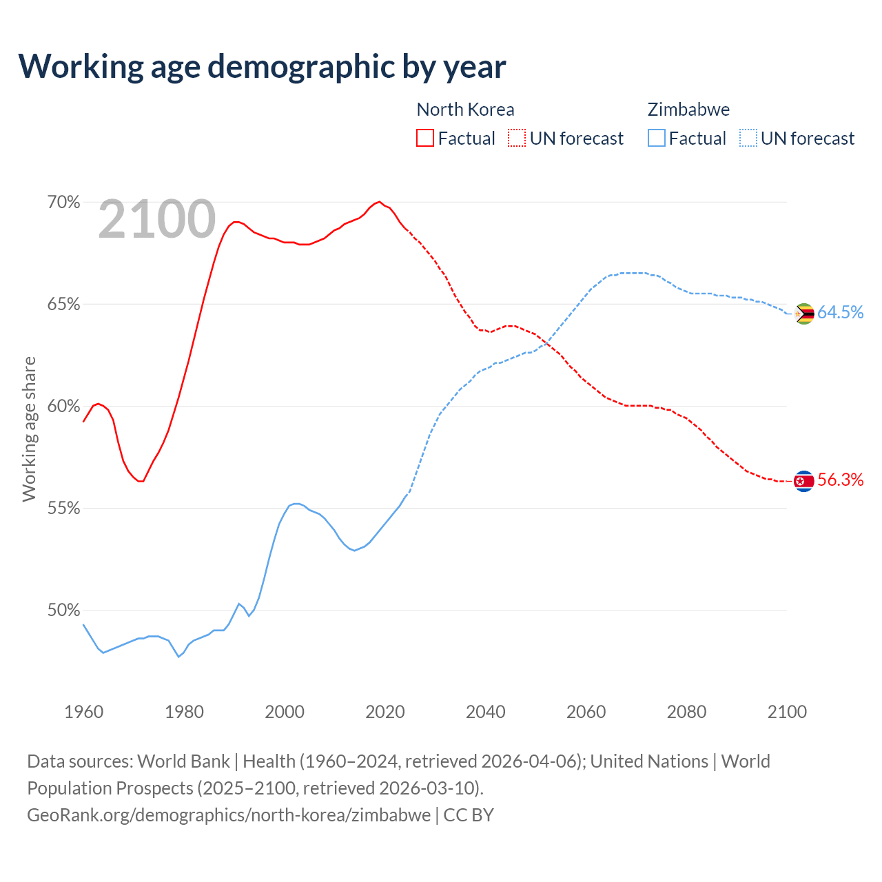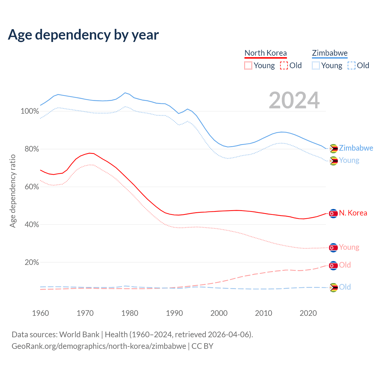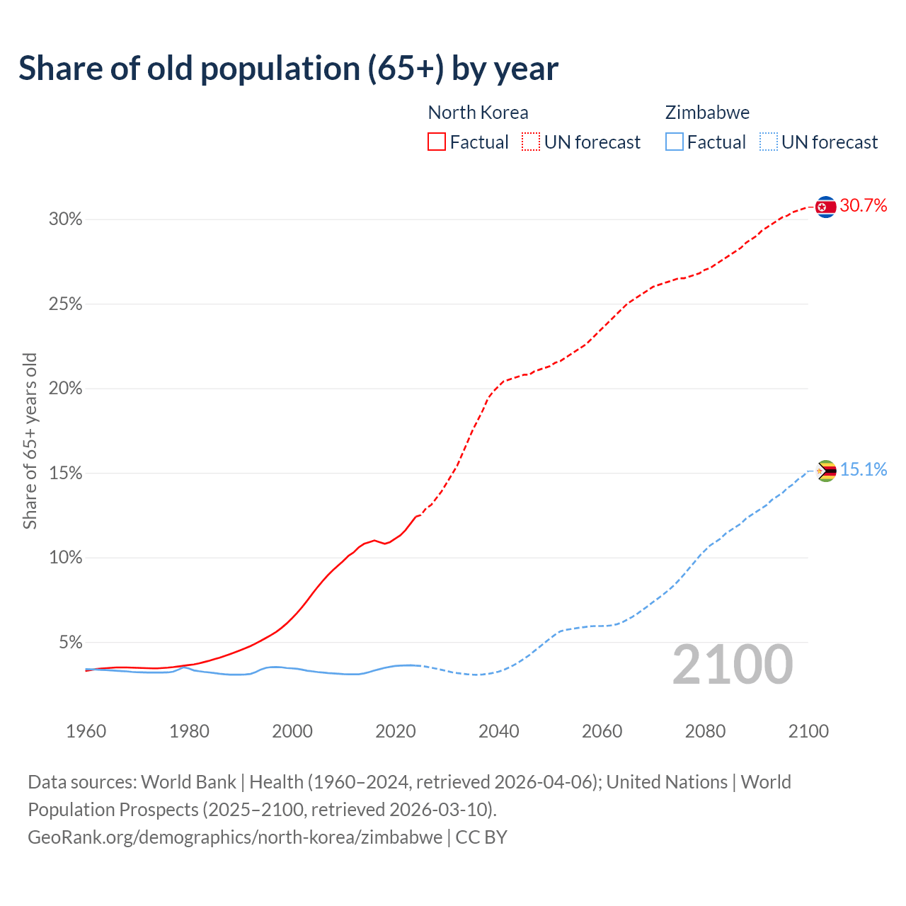 The share of older people aged 65 and over is 12.4% in North Korea and 3.6% in Zimbabwe. Life expectancy in North Korea compared to Zimbabwe .