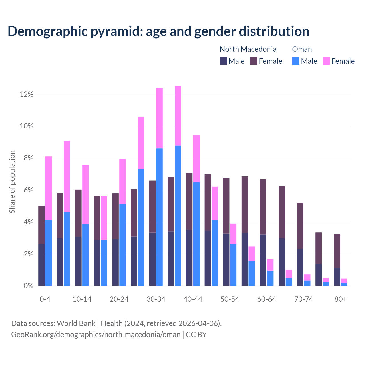 - North Macedonia is ranked 37/196 by median age (oldest to youngest) vs 101/196 for Oman.