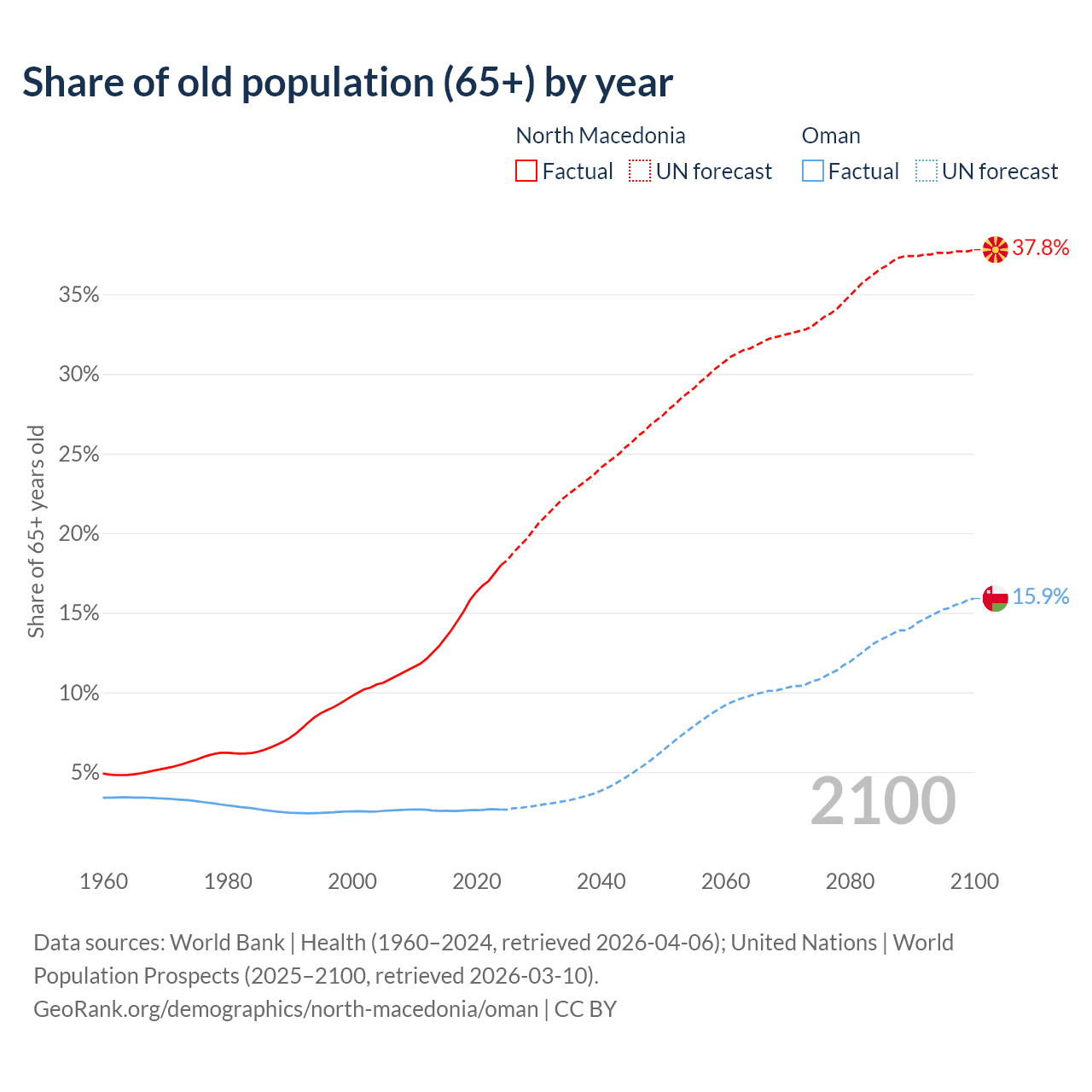 The share of older people aged 65 and over is 18% in North Macedonia and 2.64% in Oman. Life expectancy in North Macedonia compared to Oman .