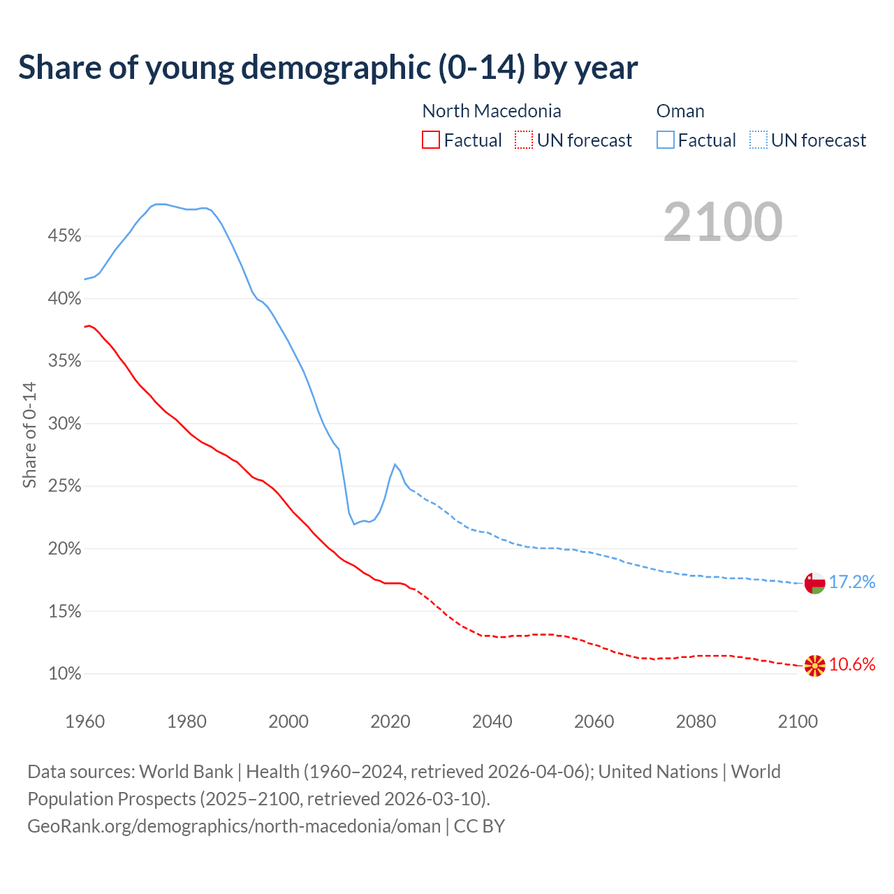 - The share of young demographic (0-15 years old) in North Macedonia is 16.8% vs 24.7% in Oman.