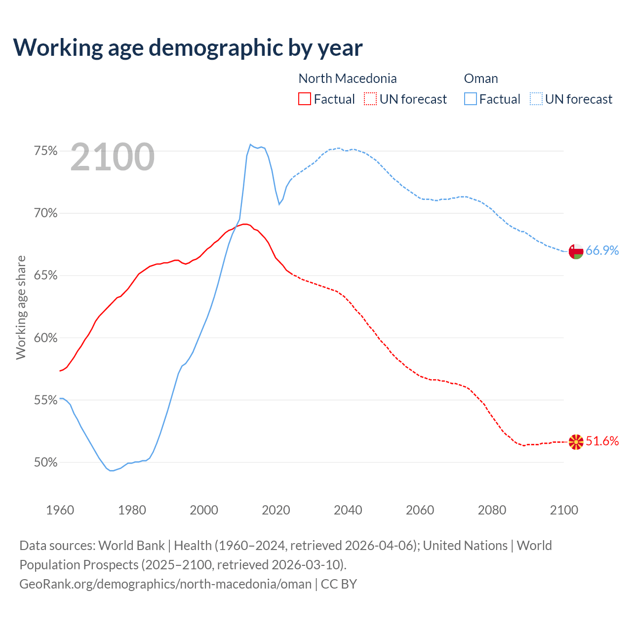 - North Macedonia has 1.18M working age adults (aged 15-64) vs 4.19M in Oman.