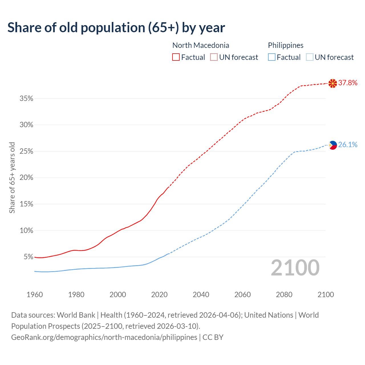 The share of older people aged 65 and over is 18% in North Macedonia and 5.49% in the Philippines. Life expectancy in North Macedonia compared to the Philippines .