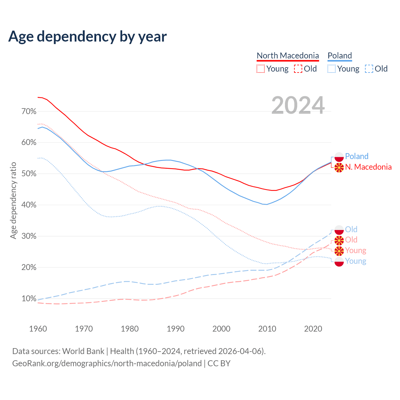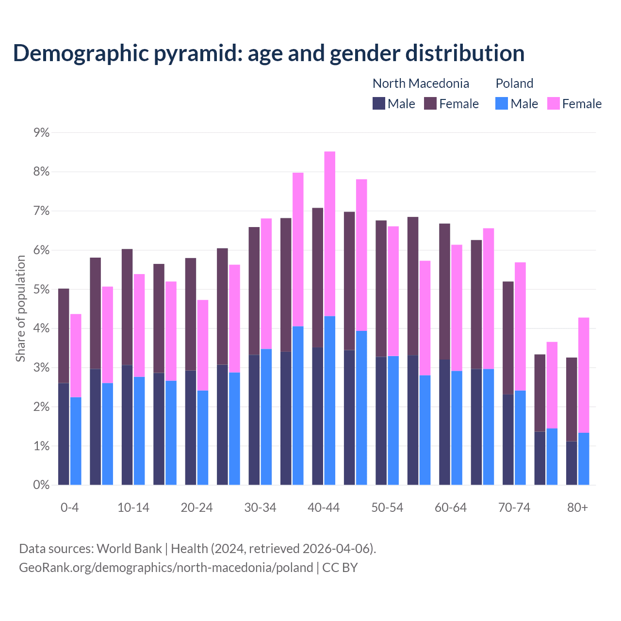 - North Macedonia is ranked 37/196 by median age (oldest to youngest) vs 30/196 for Poland.