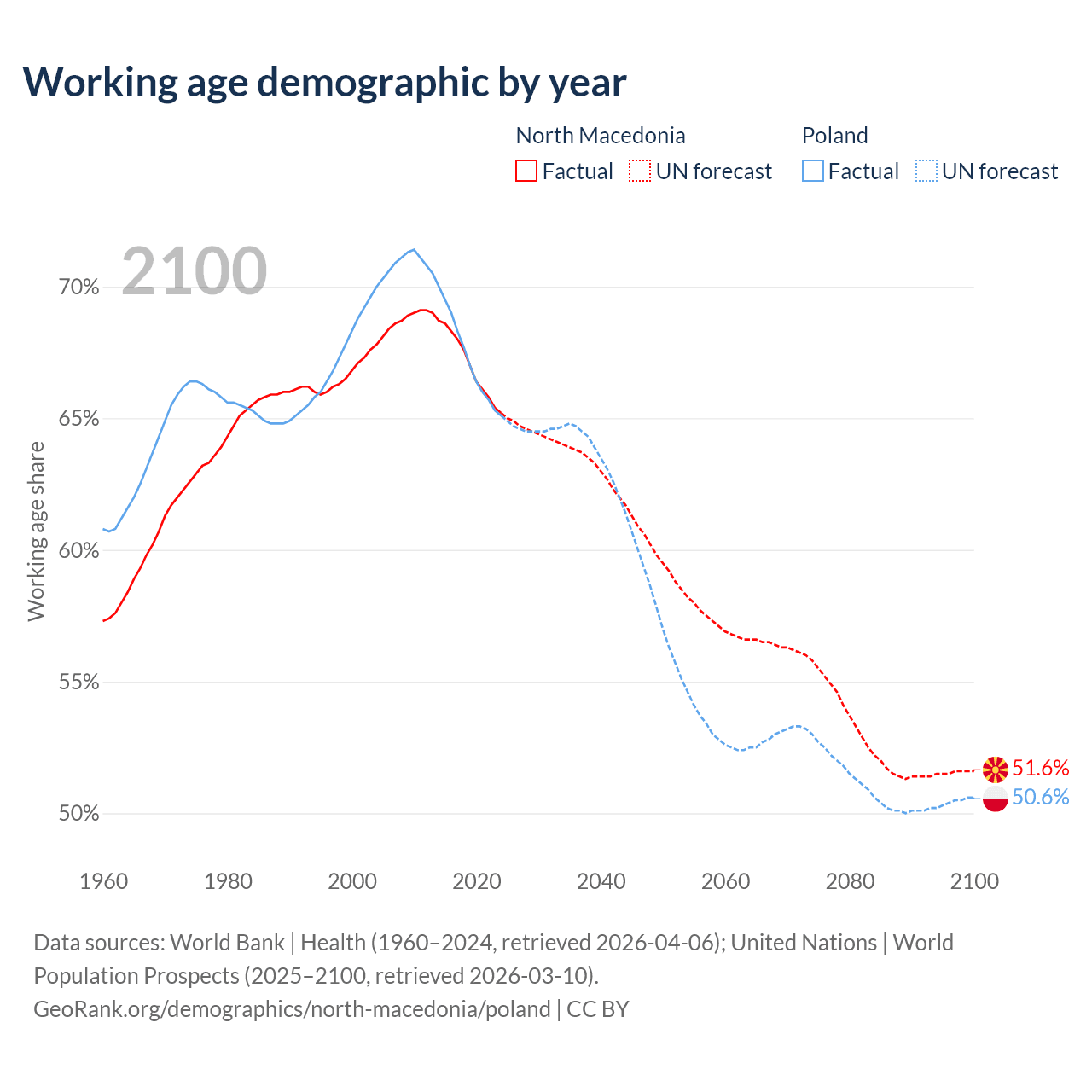 The share of older people aged 65 and over is 18% in North Macedonia and 20.1% in Poland. Life expectancy in North Macedonia compared to Poland .