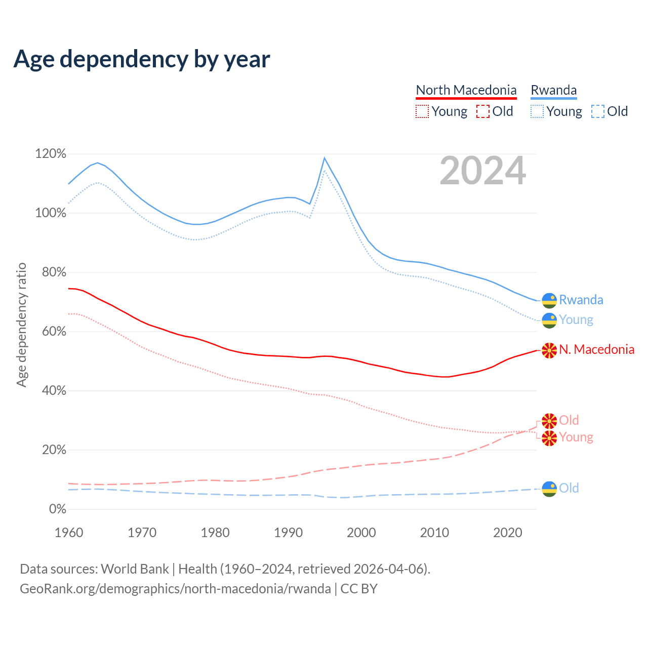 The share of older people aged 65 and over is 18% in North Macedonia and 3.93% in Rwanda. Life expectancy in North Macedonia compared to Rwanda .