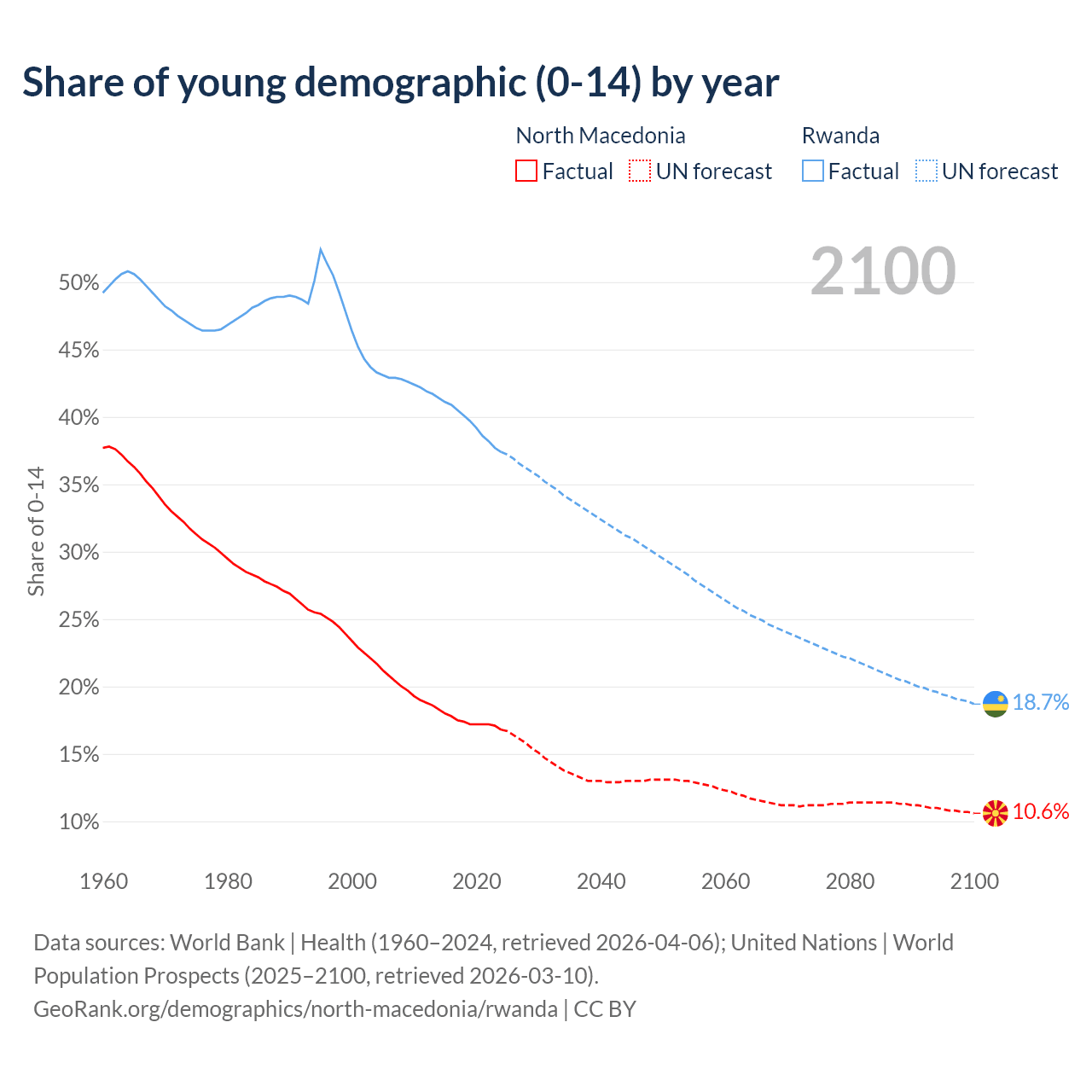 - The share of young demographic (0-15 years old) in North Macedonia is 16.8% vs 37.4% in Rwanda.