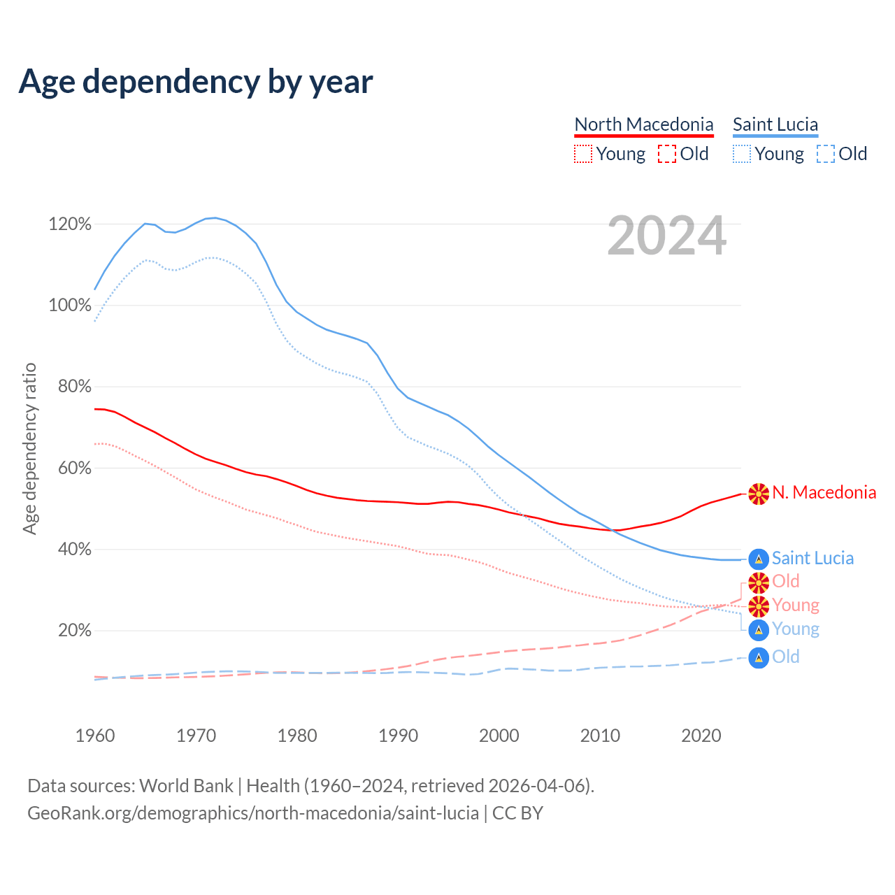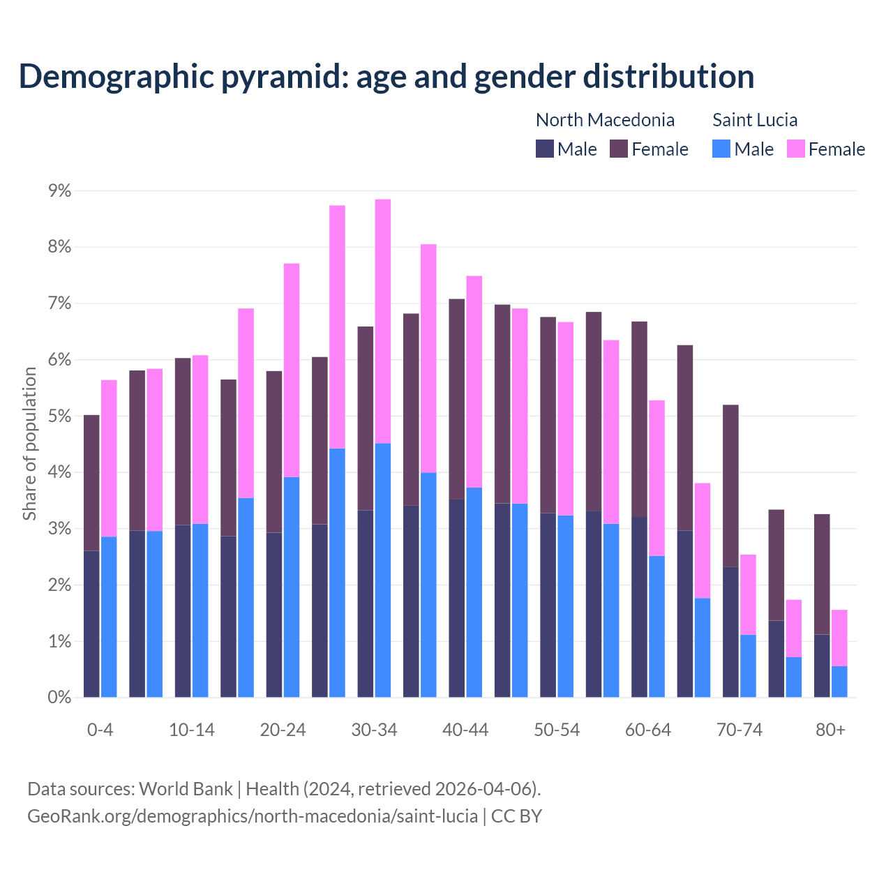 - North Macedonia is ranked 37/196 by median age (oldest to youngest) vs 74/196 for Saint Lucia.