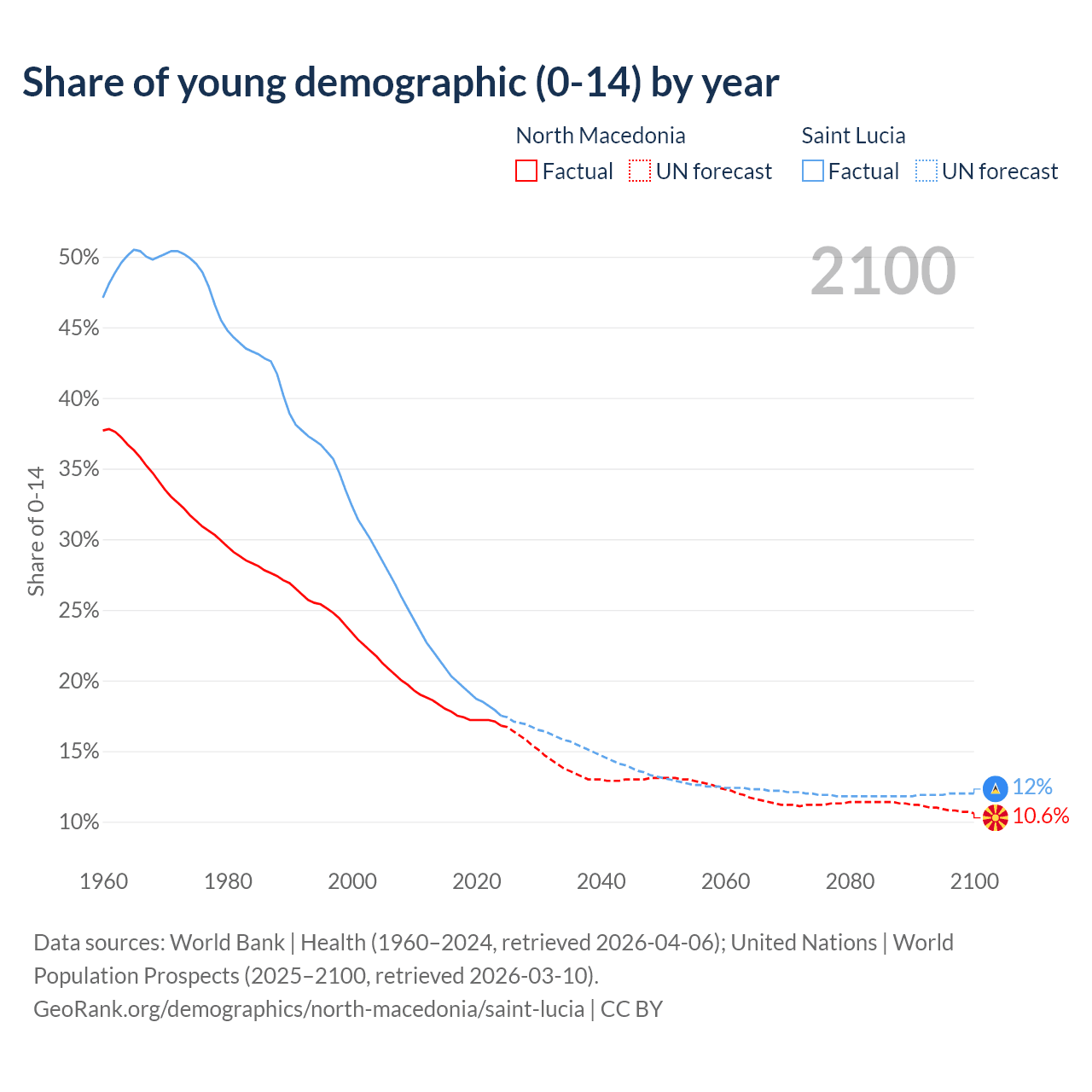 - The share of young demographic (0-15 years old) in North Macedonia is 16.8% vs 17.5% in Saint Lucia.