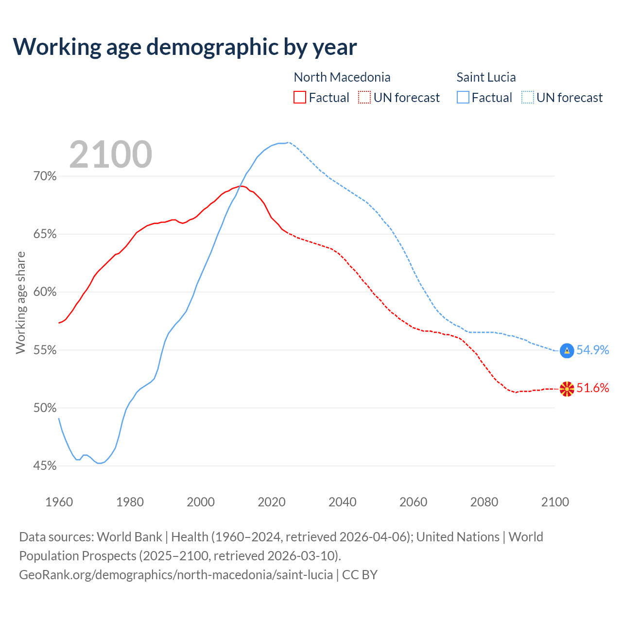 - North Macedonia has 1.18M working age adults (aged 15-64) vs 132K in Saint Lucia.