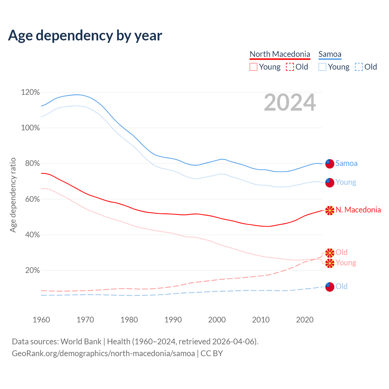 - The share of old-age demographic (65+) in North Macedonia is 18% vs 5.88% in Samoa.