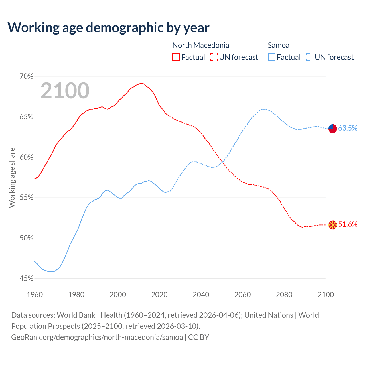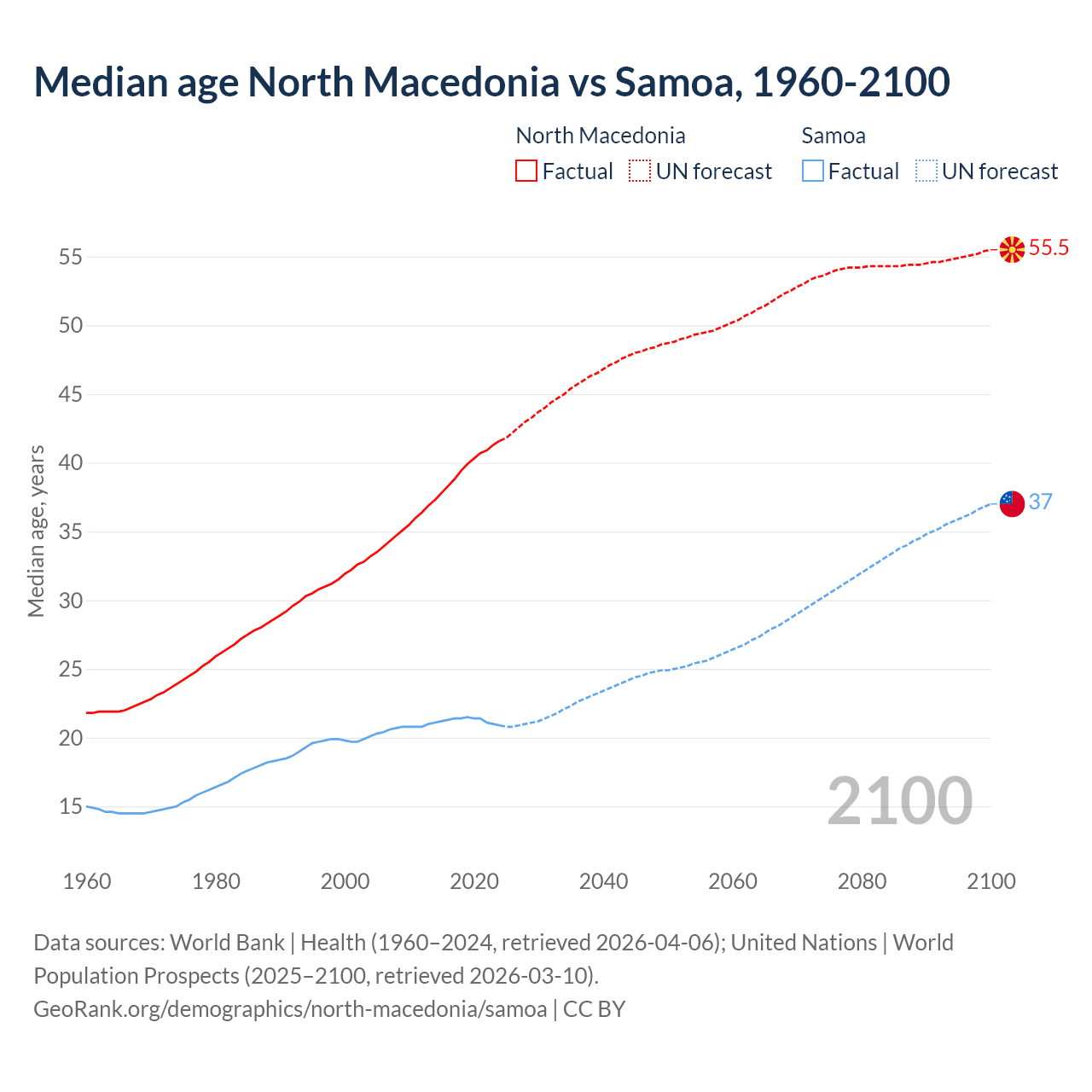 Median age North Macedonia vs Samoa, 1960-2100