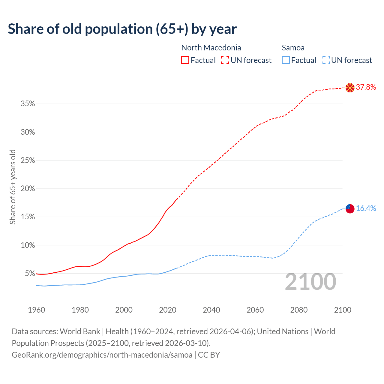 The share of older people aged 65 and over is 18% in North Macedonia and 5.88% in Samoa. Life expectancy in North Macedonia compared to Samoa .