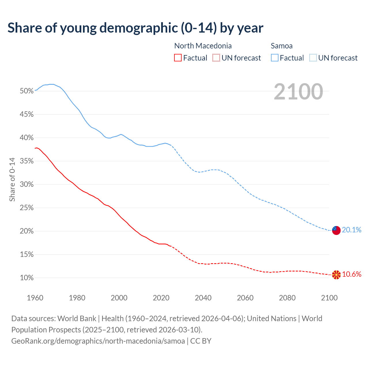 - The share of young demographic (0-15 years old) in North Macedonia is 16.8% vs 38.5% in Samoa.