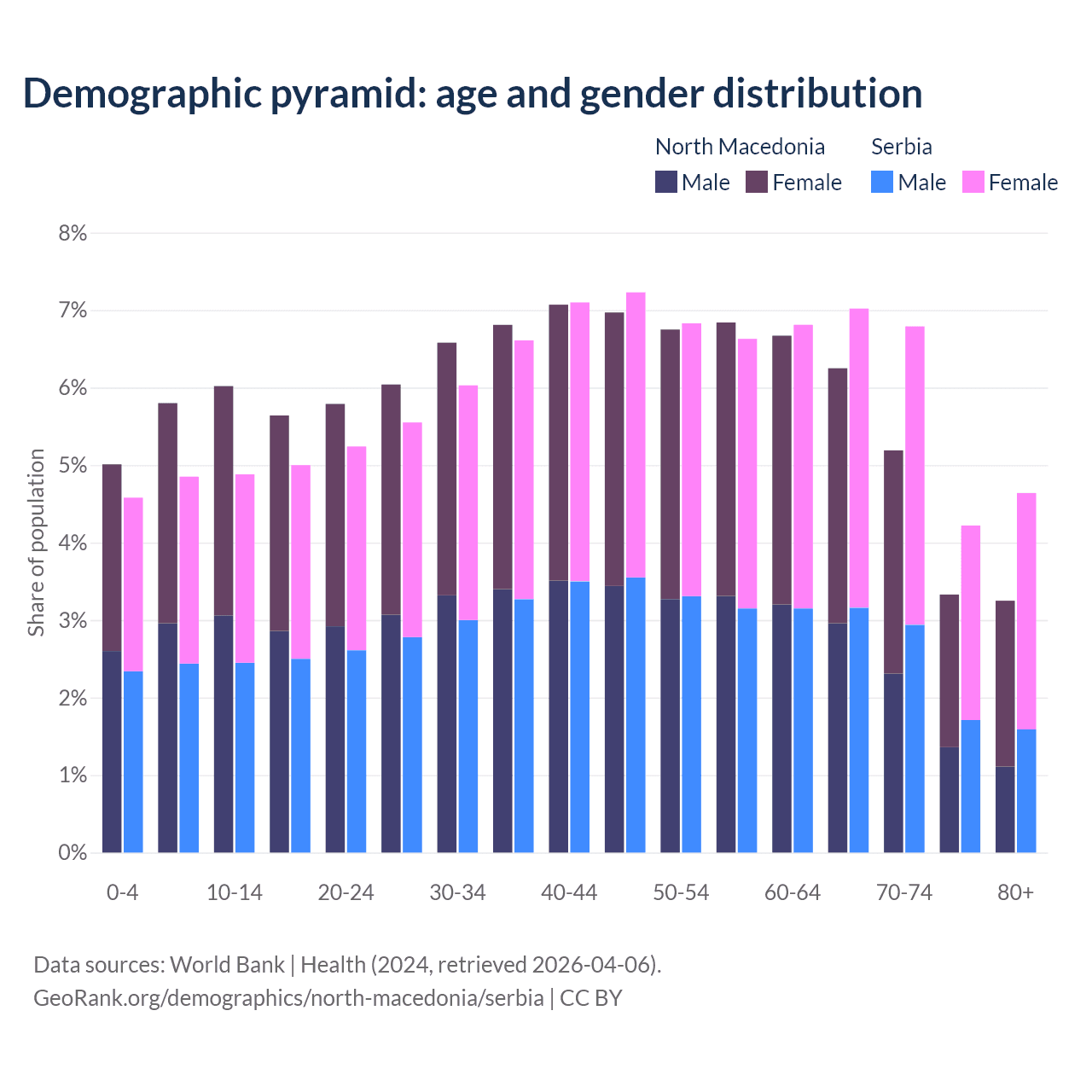 - North Macedonia is ranked 37/196 by median age (oldest to youngest) vs 15/196 for Serbia.