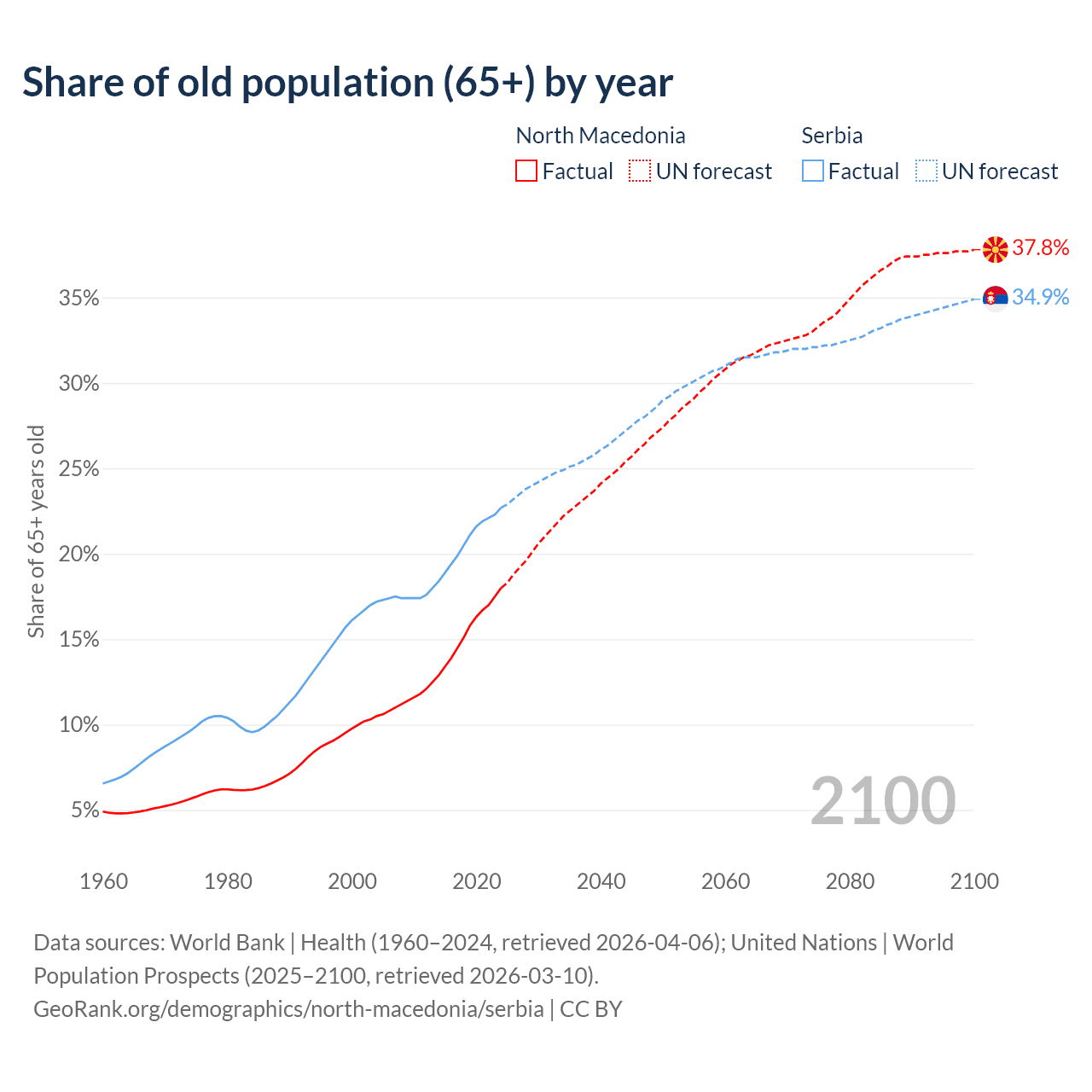 The share of older people aged 65 and over is 18% in North Macedonia and 22.7% in Serbia. Life expectancy in North Macedonia compared to Serbia .