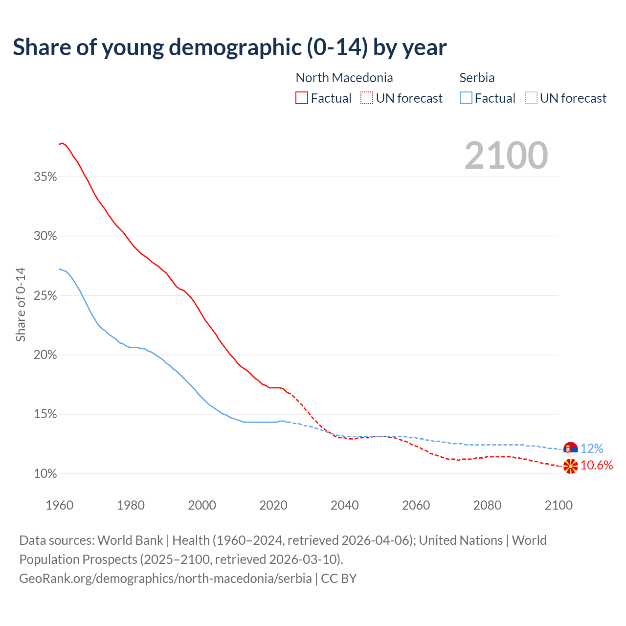 - The share of young demographic (0-15 years old) in North Macedonia is 16.8% vs 14.3% in Serbia.