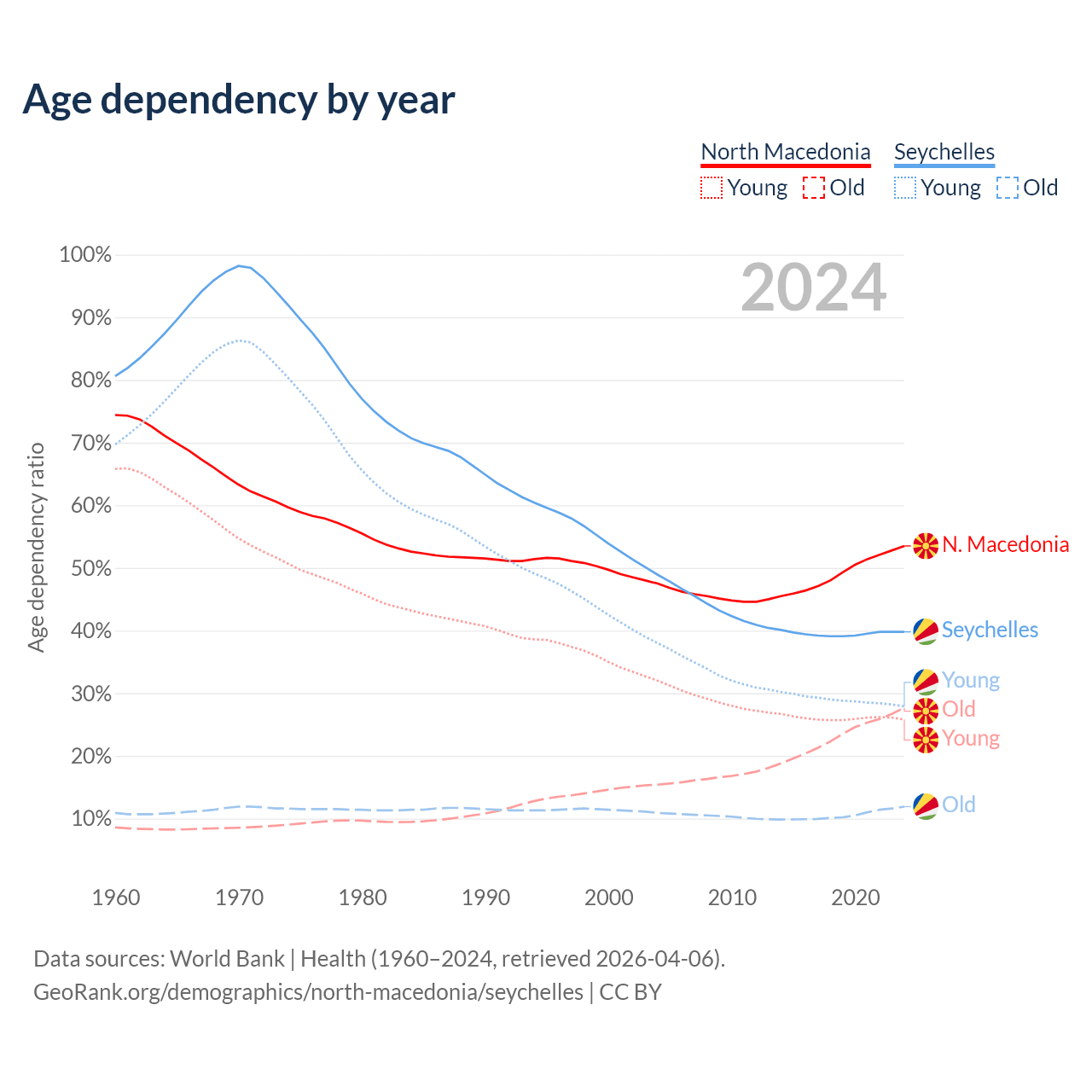 - North Macedonia is ranked 37/196 by median age (oldest to youngest) vs 76/196 for the Seychelles.