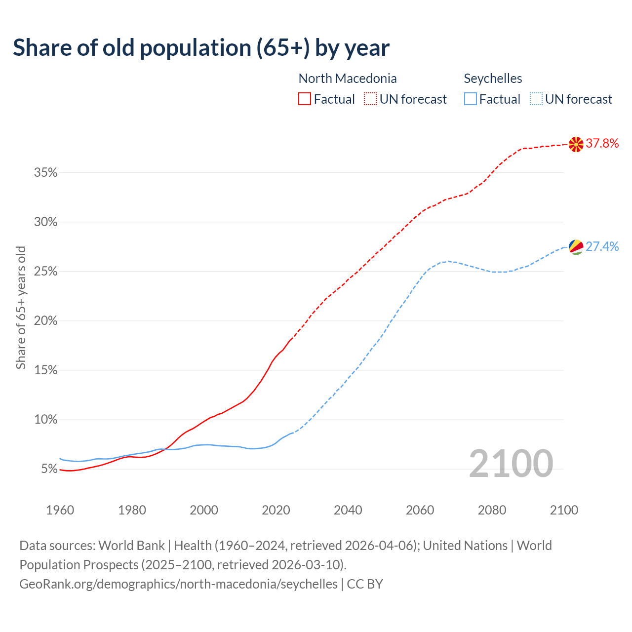 - The share of old-age demographic (65+) in North Macedonia is 18% vs 8.54% in the Seychelles.