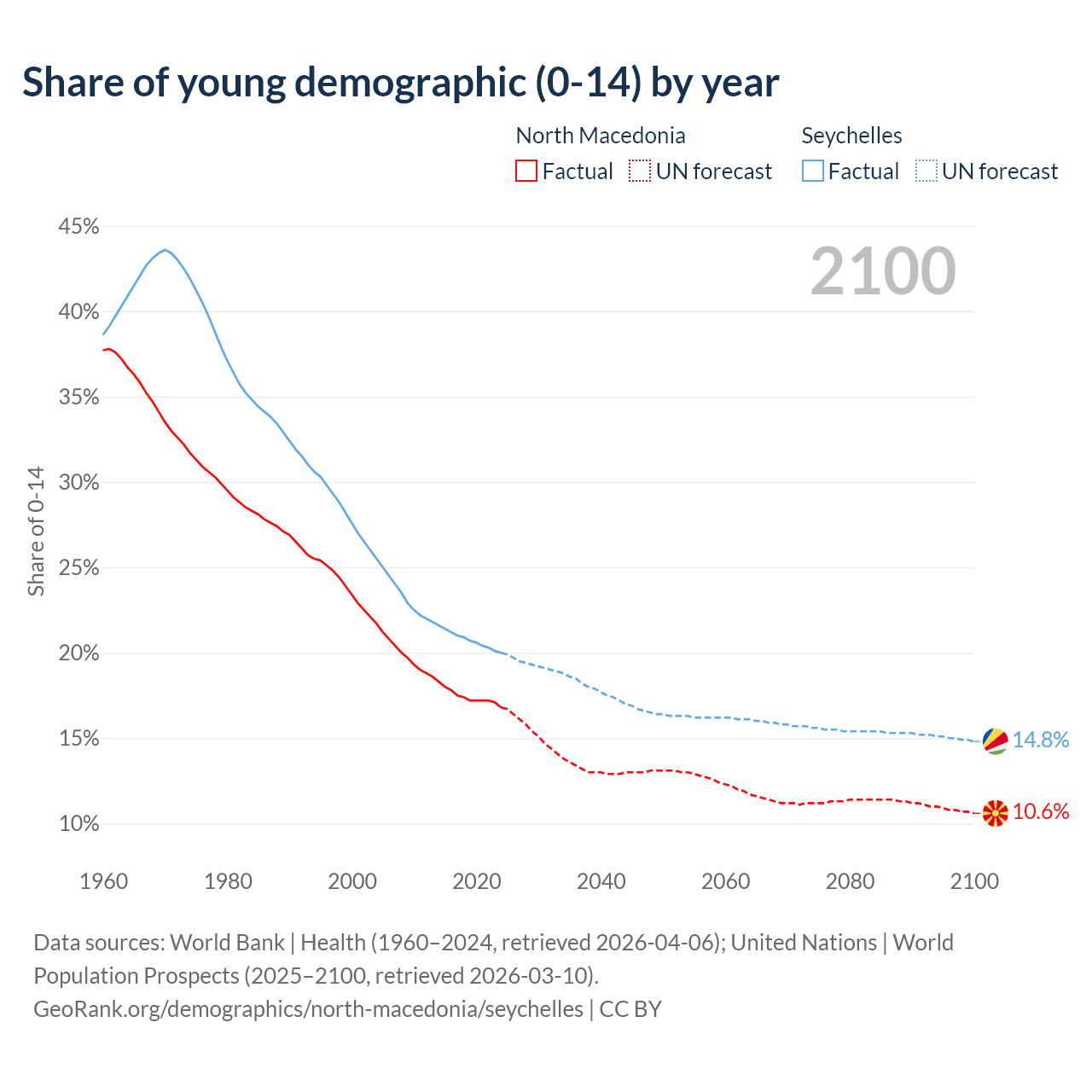 - The share of young demographic (0-15 years old) in North Macedonia is 16.8% vs 20% in the Seychelles.