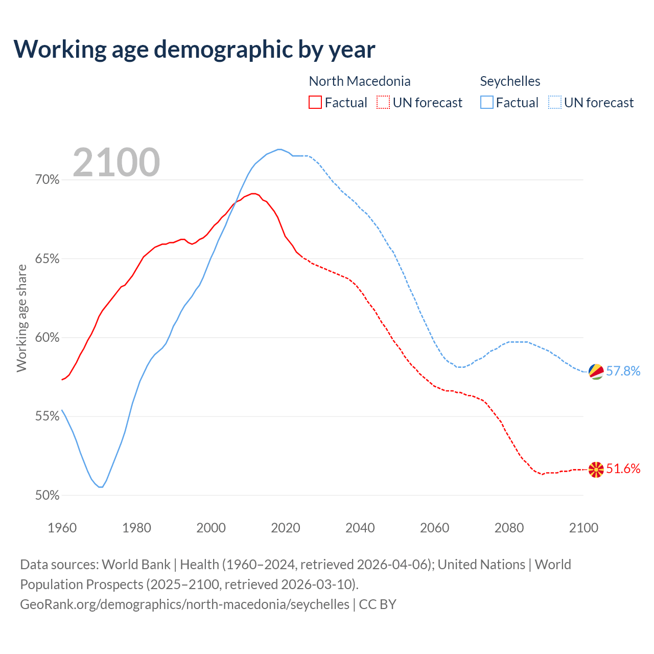 - North Macedonia has 1.18M working age adults (aged 15-64) vs 90.3K in the Seychelles.