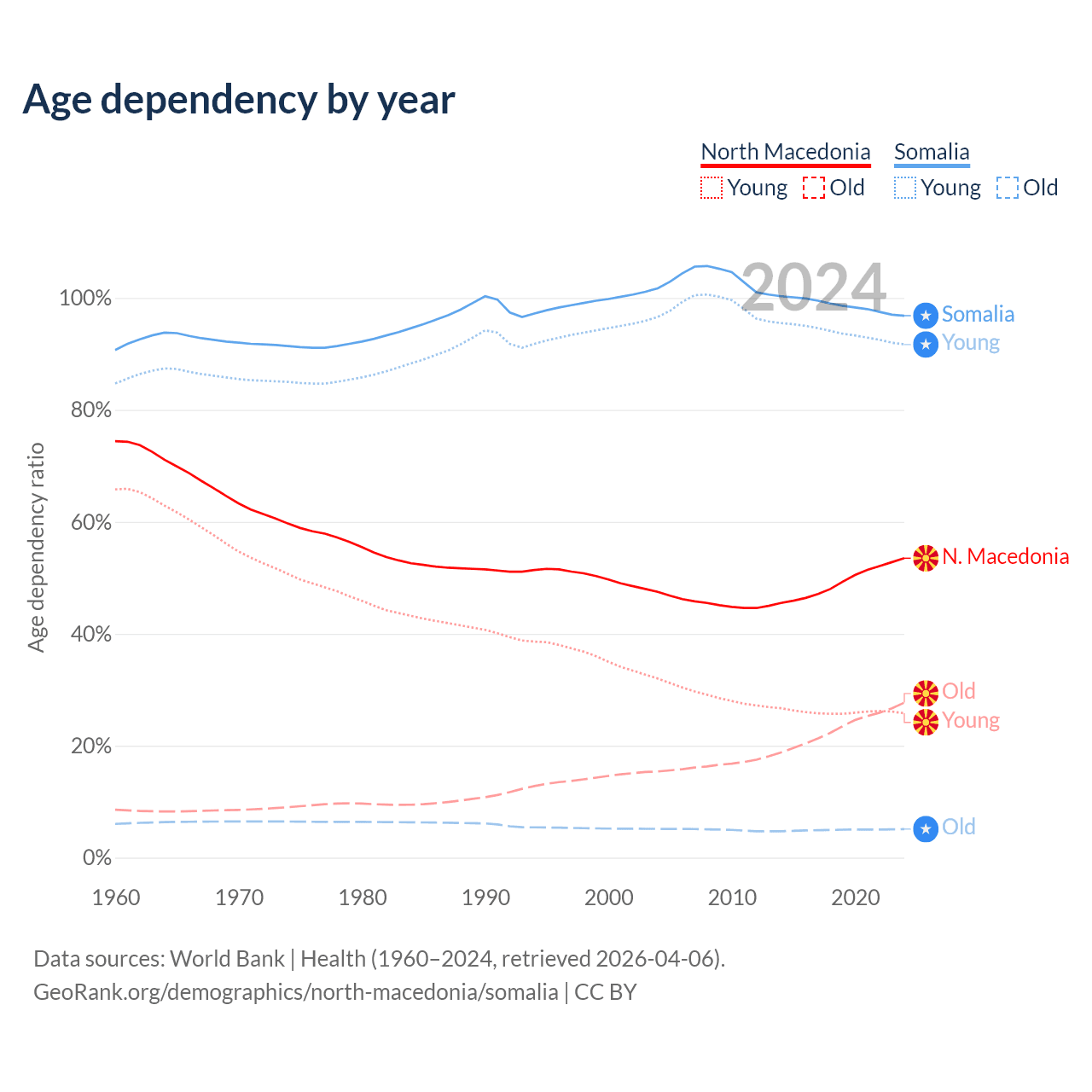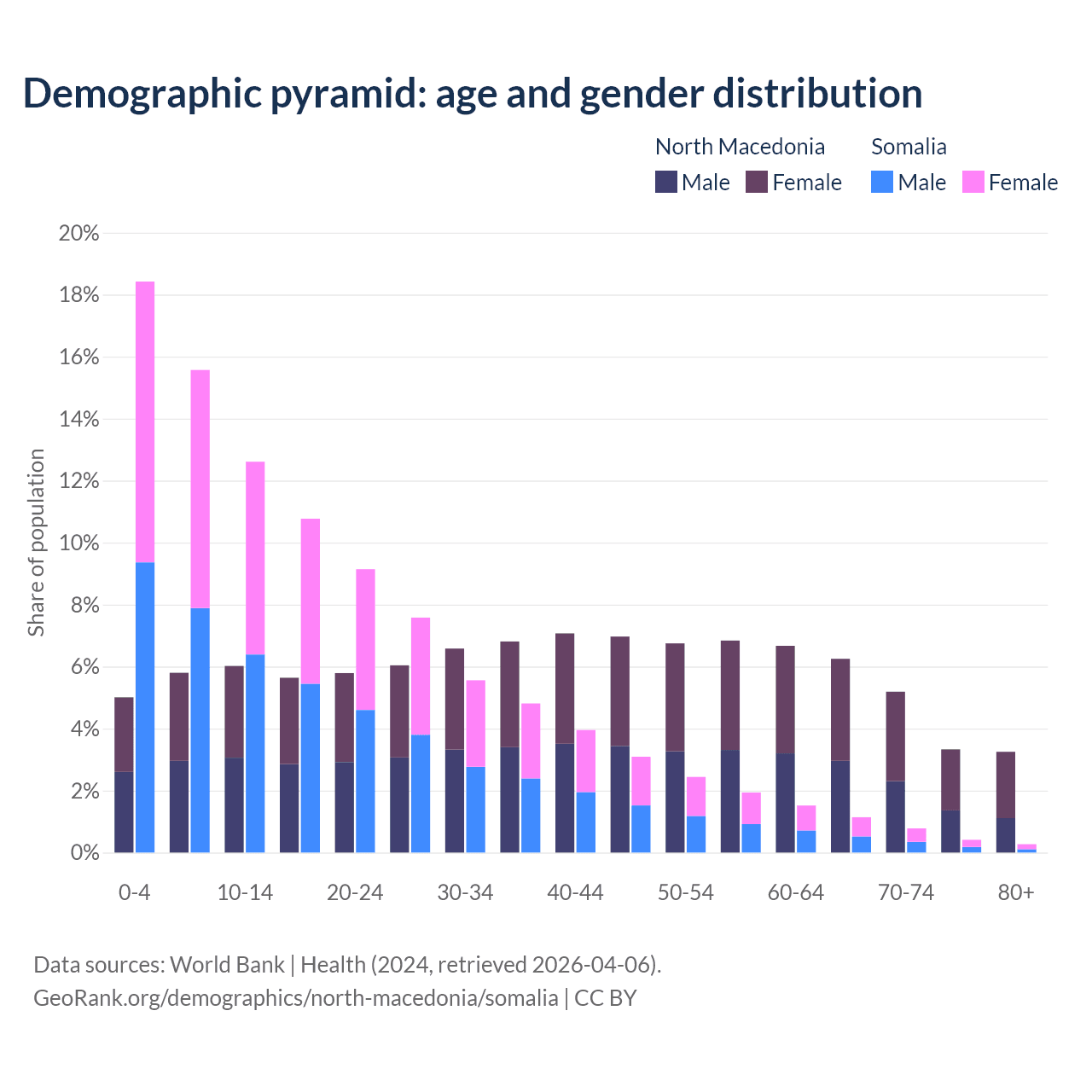 - North Macedonia is ranked 37/196 by median age (oldest to youngest) vs 194/196 for Somalia.