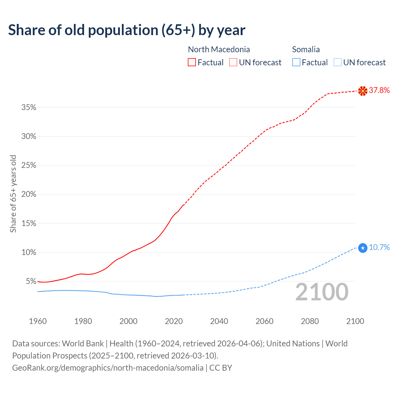- The share of old-age demographic (65+) in North Macedonia is 18% vs 2.59% in Somalia.