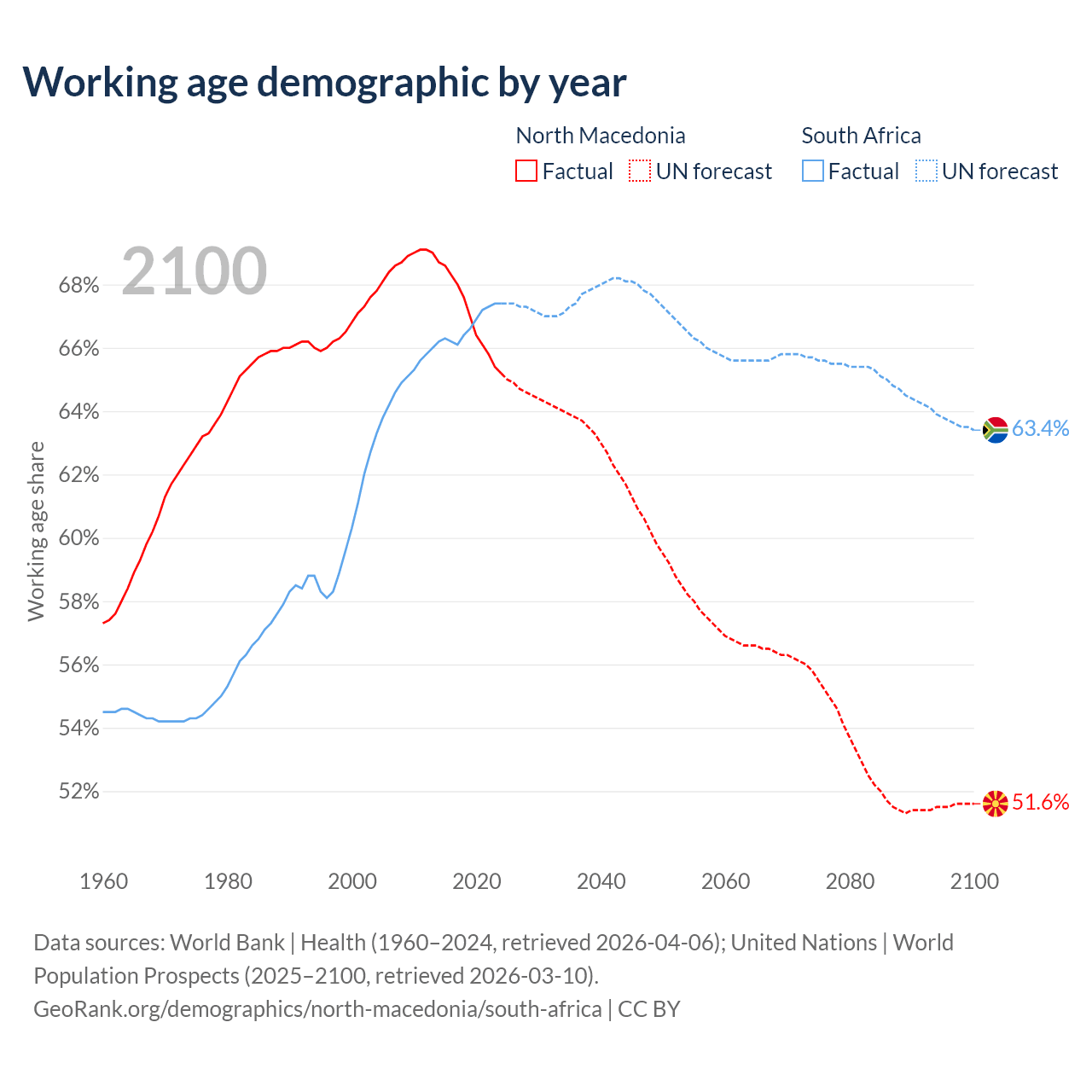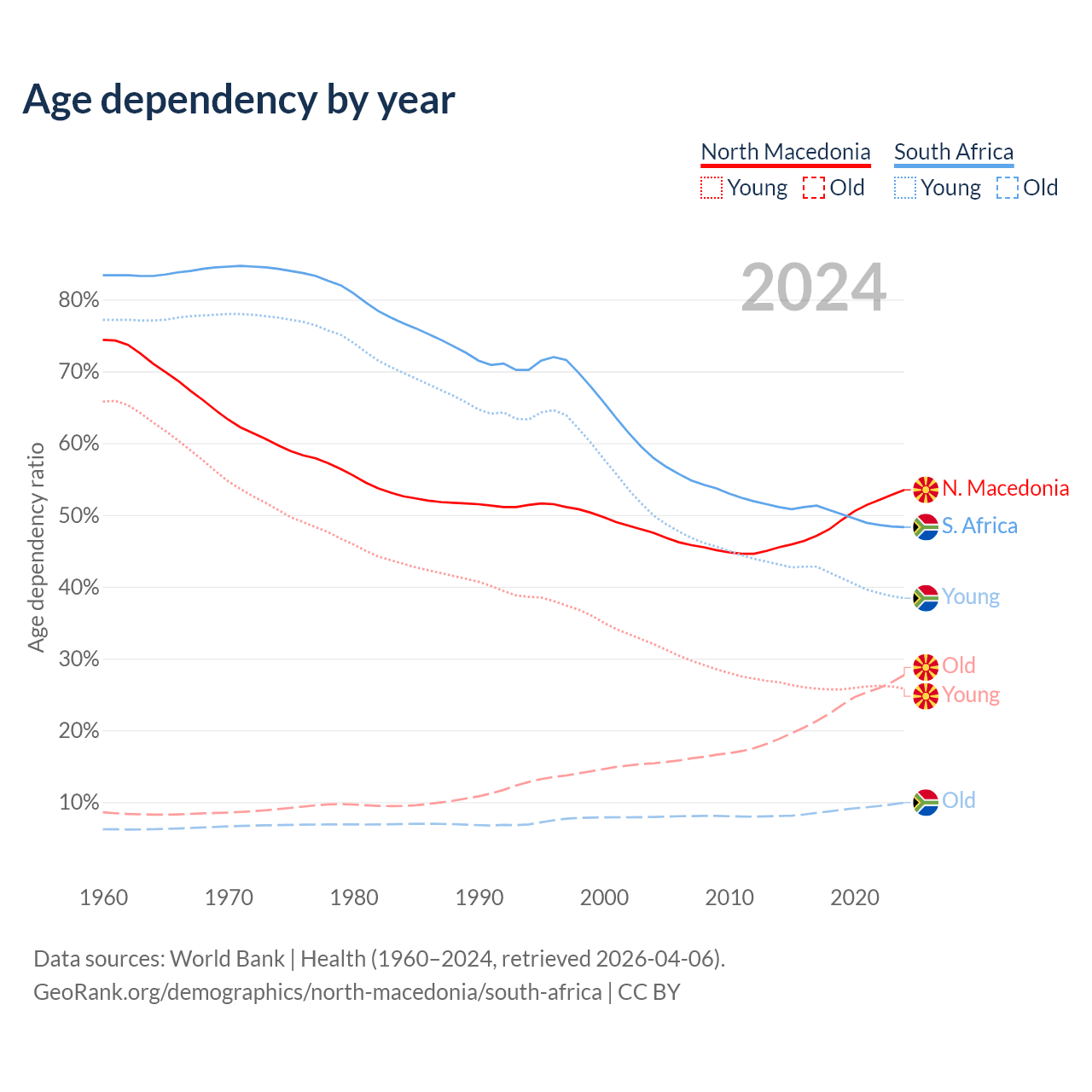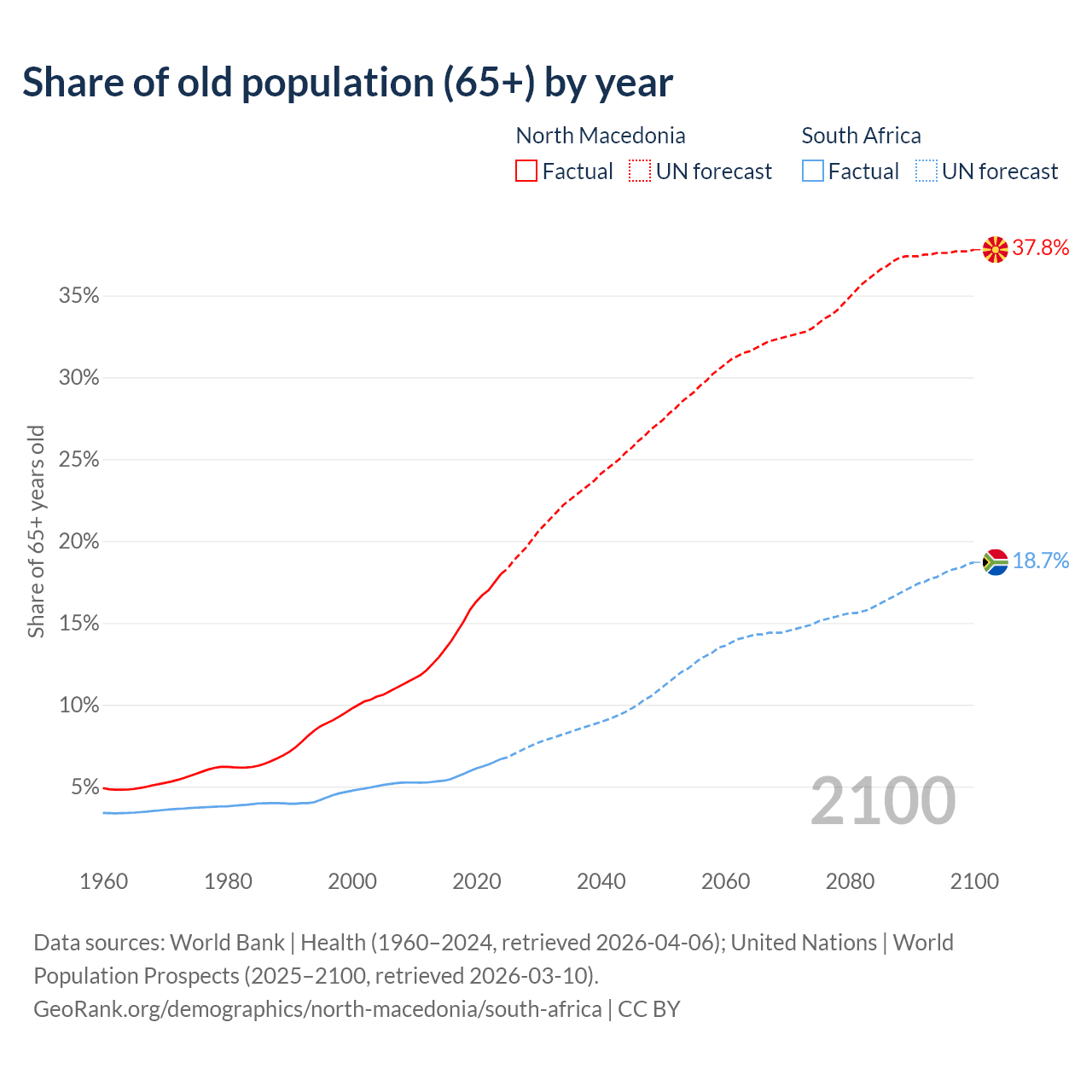 The share of older people aged 65 and over is 18% in North Macedonia and 6.69% in South Africa. Life expectancy in North Macedonia compared to South Africa .