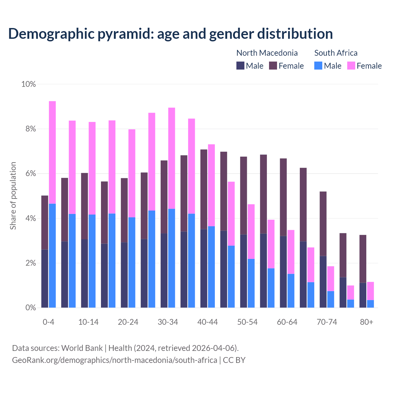 - North Macedonia is ranked 37/196 by median age (oldest to youngest) vs 107/196 for South Africa.