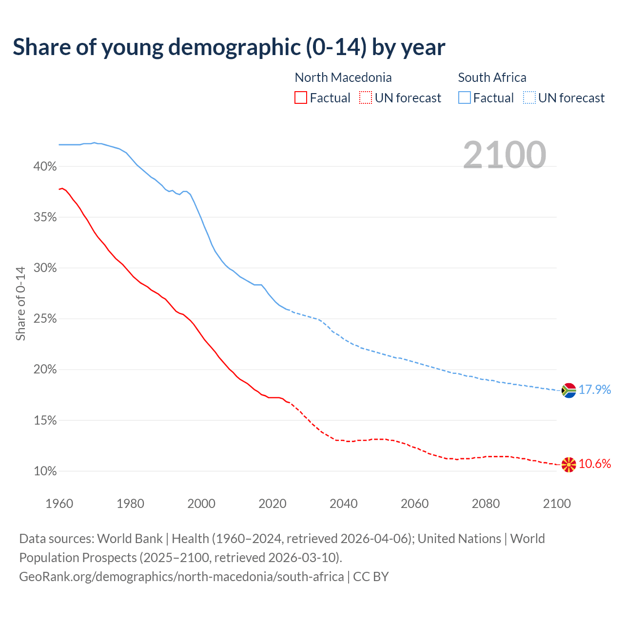 - The share of young demographic (0-15 years old) in North Macedonia is 16.8% vs 25.9% in South Africa.