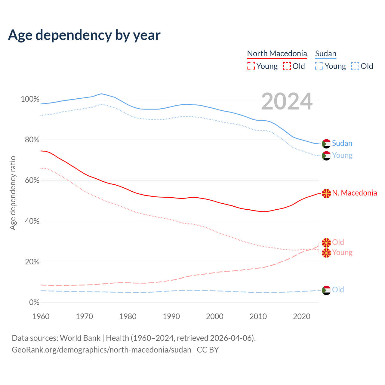The share of older people aged 65 and over is 18% in North Macedonia and 3.3% in Sudan. Life expectancy in North Macedonia compared to Sudan .
