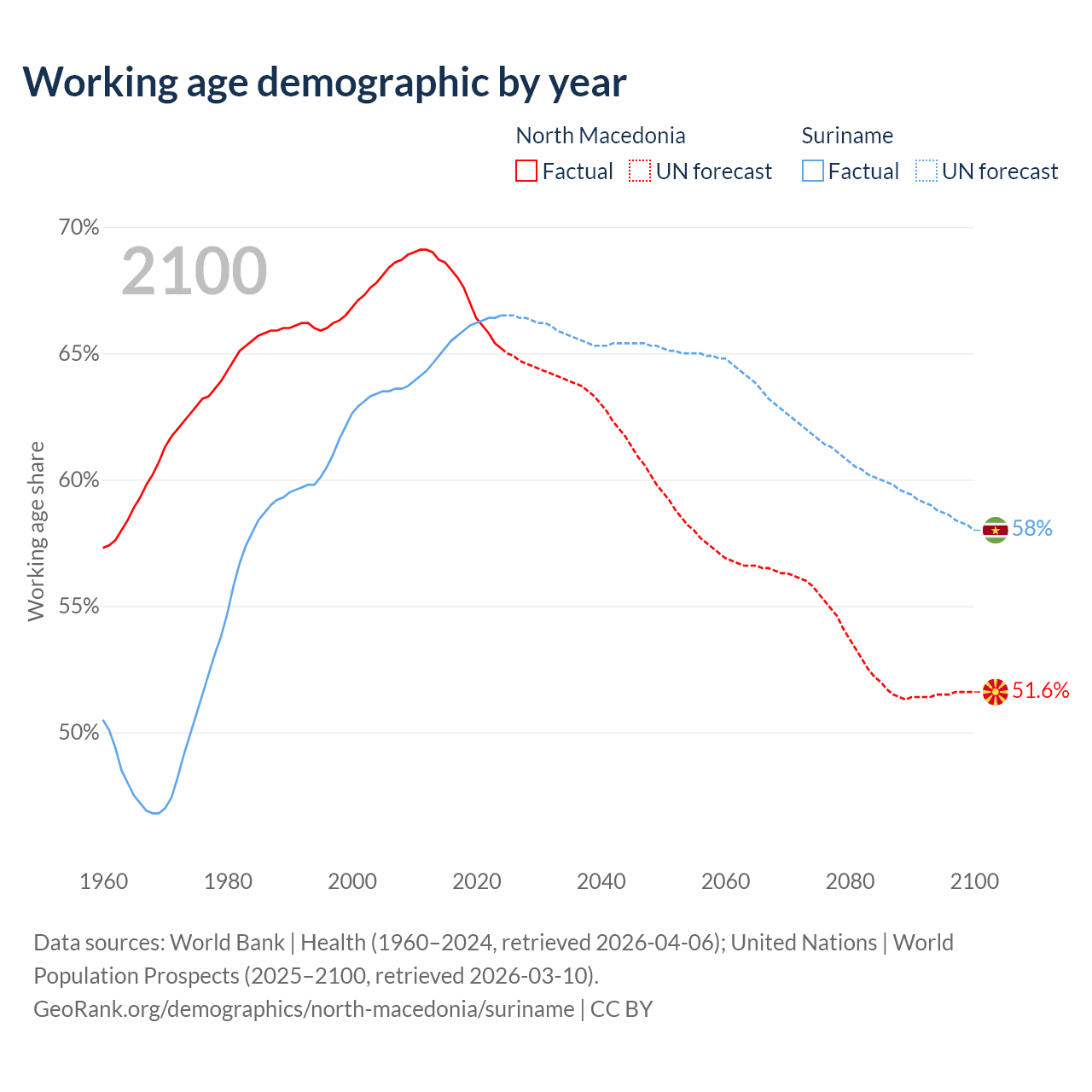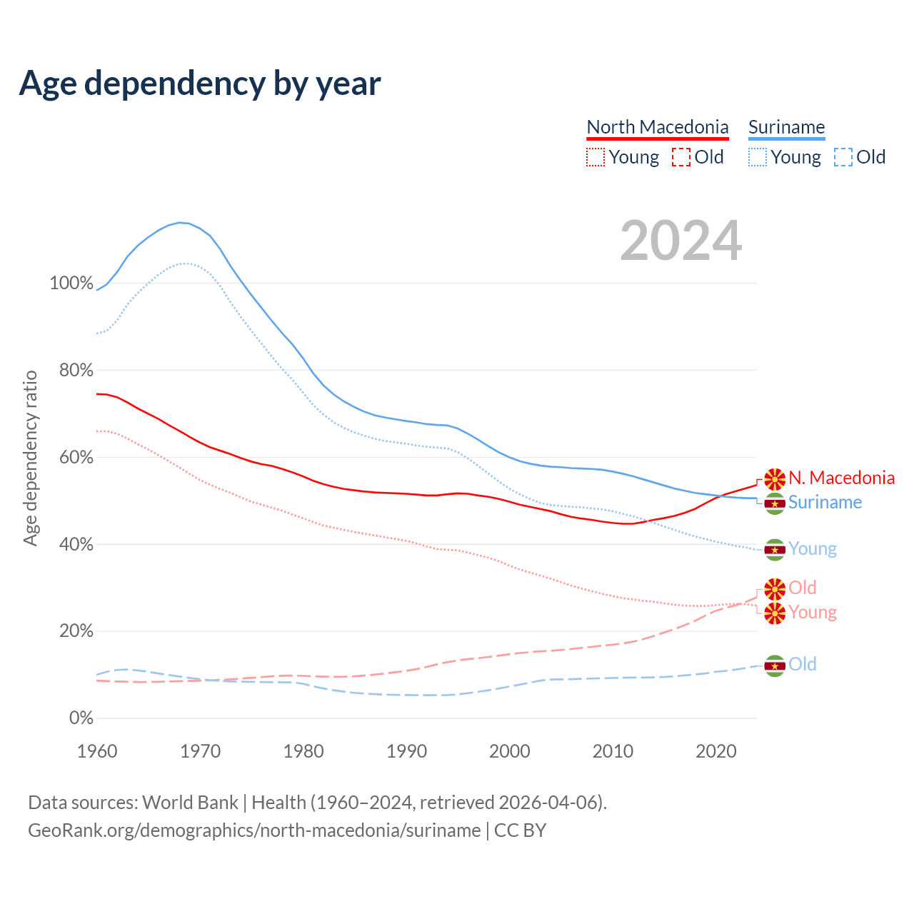 - The share of young demographic (0-15 years old) in North Macedonia is 16.8% vs 25.6% in Suriname.