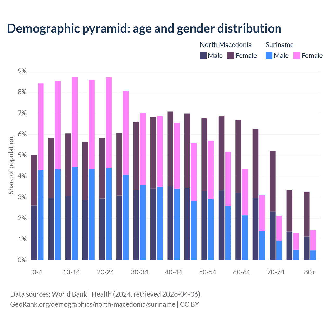- North Macedonia is ranked 37/196 by median age (oldest to youngest) vs 109/196 for Suriname.