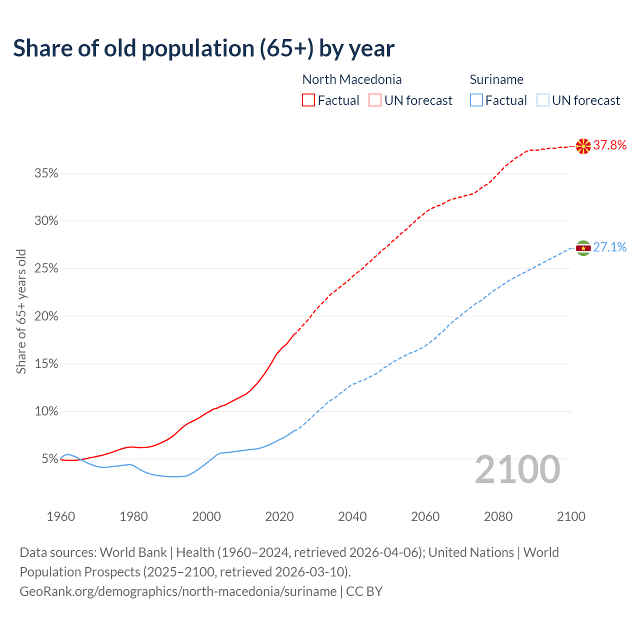 The share of older people aged 65 and over is 18% in North Macedonia and 7.9% in Suriname. Life expectancy in North Macedonia compared to Suriname .
