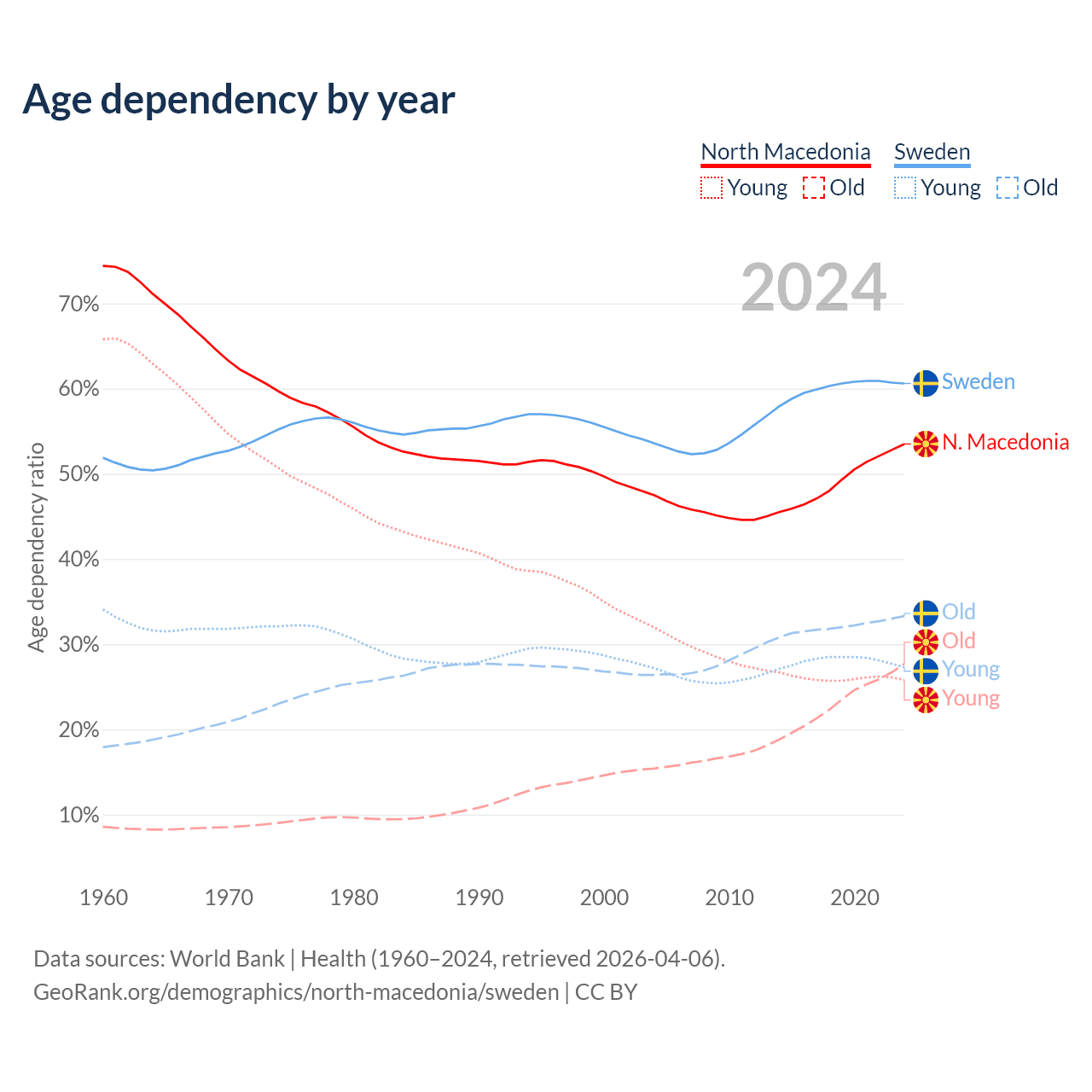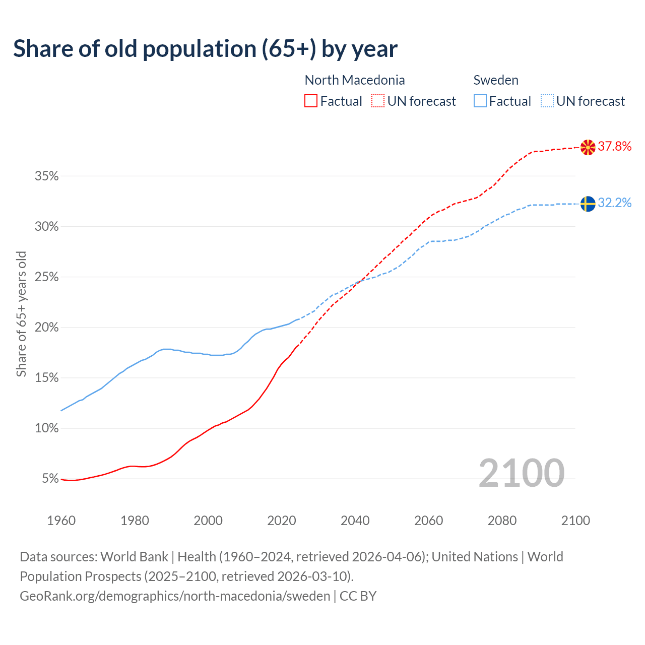 The share of older people aged 65 and over is 18% in North Macedonia and 20.7% in Sweden. Life expectancy in North Macedonia compared to Sweden .